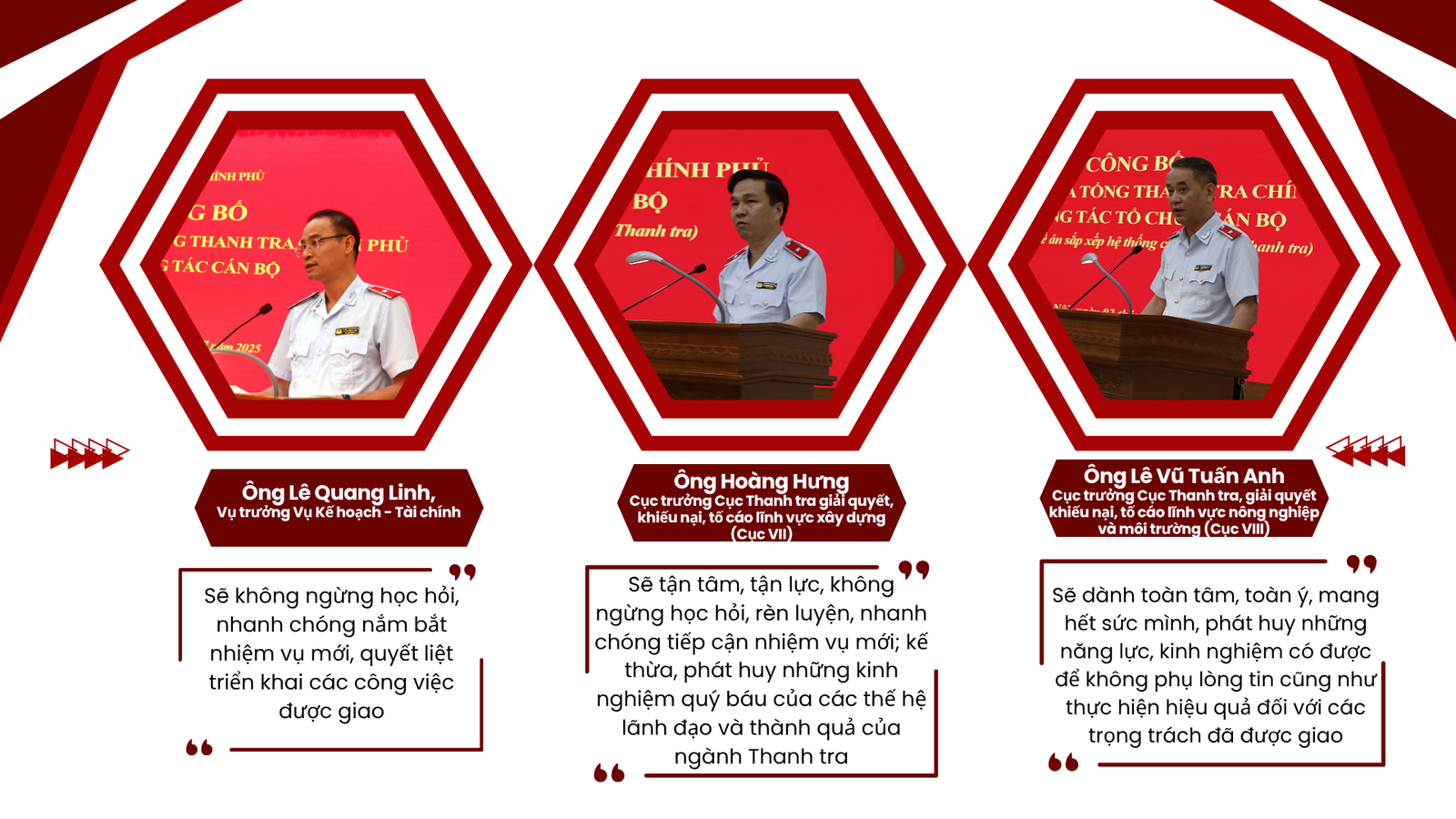 Các cán bộ được bổ nhiệm đều thể hiện tinh thần sẵn sàng nhận nhiệm vụ và cam kết cao. Ông Lê Quang Linh, Vụ trưởng Vụ Kế hoạch - Tài chính, một cán bộ được đào tạo bài bản và có hơn 12 năm kinh nghiệm trong lĩnh vực này, chia sẻ: “nhiệm vụ được giao vừa là vinh dự, vừa là trách nhiệm lớn lao trước yêu cầu ngày càng cao của Ban Thường vụ Đảng ủy, lãnh đạo Thanh tra Chính phủ”. Ông Linh cam kết: “sẽ không ngừng học hỏi, nhanh chóng nắm bắt nhiệm vụ mới, quyết liệt triển khai các công việc được giao; kế thừa kết quả, kinh nghiệm của các thế hệ lãnh đạo vụ; nêu cao tinh thần, trách nhiệm của người đứng đầu”.