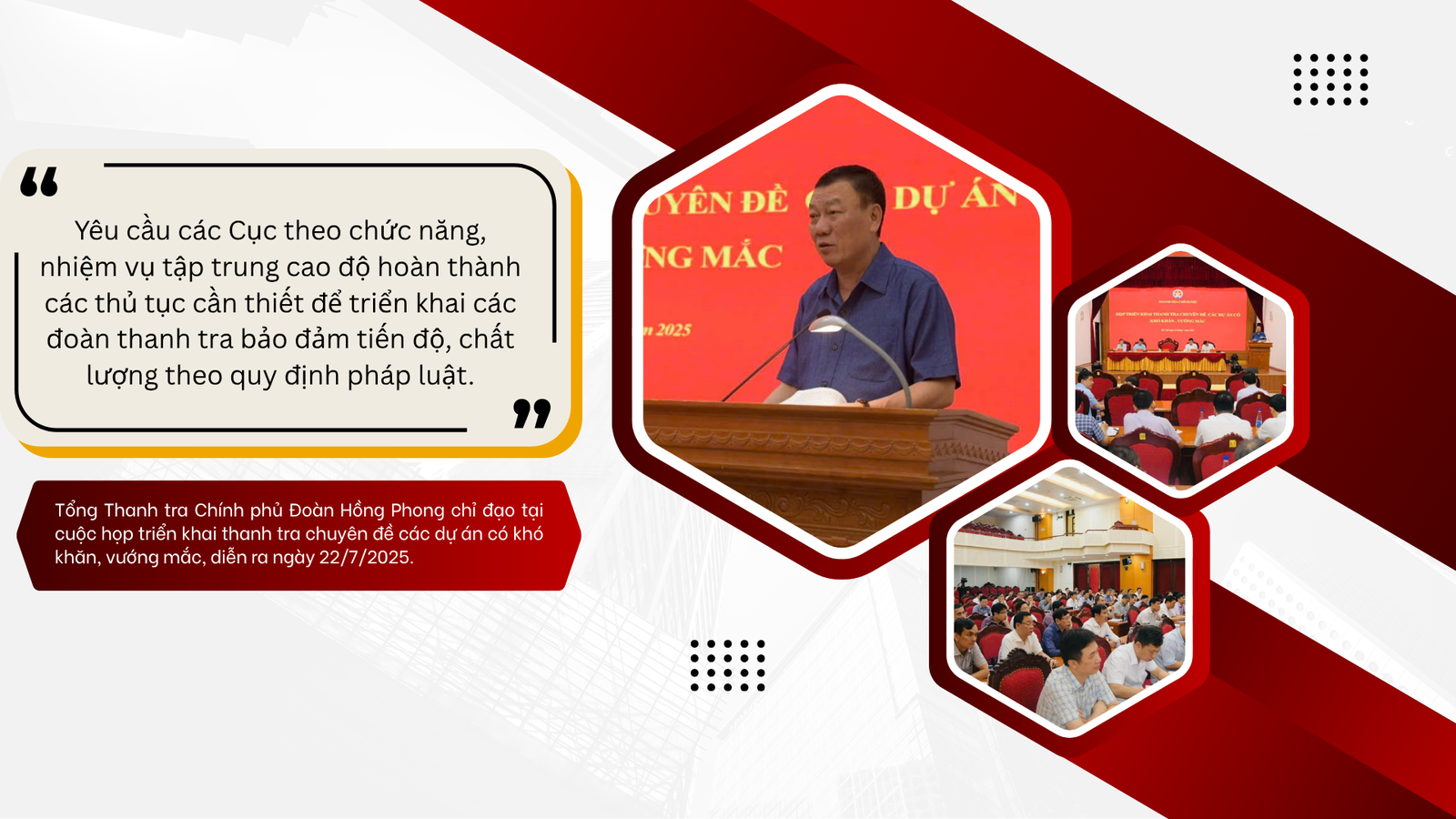 Ngay lập tức, ngành Thanh tra đã bắt tay vào các nhiệm vụ trọng tâm. Tại cuộc họp ngày 22/7/2025, Tổng Thanh tra Chính phủ Đoàn Hồng Phong đã yêu cầu các Cục “tập trung cao độ hoàn thành các thủ tục cần thiết để triển khai các đoàn thanh tra bảo đảm tiến độ, chất lượng theo quy định pháp luật” đối với các dự án có khó khăn, vướng mắc, chậm tiến độ, tồn đọng, kéo dài, hiệu quả thấp, nguy cơ gây thất thoát, lãng phí, theo chỉ đạo của Chính phủ và Thủ tướng Chính phủ tại Nghị quyết số 205/NQ-CP. Các cuộc thanh tra do Thanh tra Chính phủ tiến hành sẽ có thời hạn không quá 45 ngày và dự kiến ban hành kết luận trước ngày 25/9/2025. Tổng Thanh tra Chính phủ cũng chỉ đạo: “Thanh tra đúng nội dung, phạm vi, đối tượng, có trọng tâm, trọng điểm, đúng thời gian theo quyết định thanh tra; thực hiện nghiêm chế độ bảo mật và chế độ thông tin, báo cáo; kế thừa kết quả của cơ quan chức năng về các nội dung liên quan có đủ cơ sở, căn cứ pháp luật; có sự phối hợp chặt chẽ giữa Thanh tra Chính phủ và các bộ, ngành, địa phương trong quá trình thanh tra”.