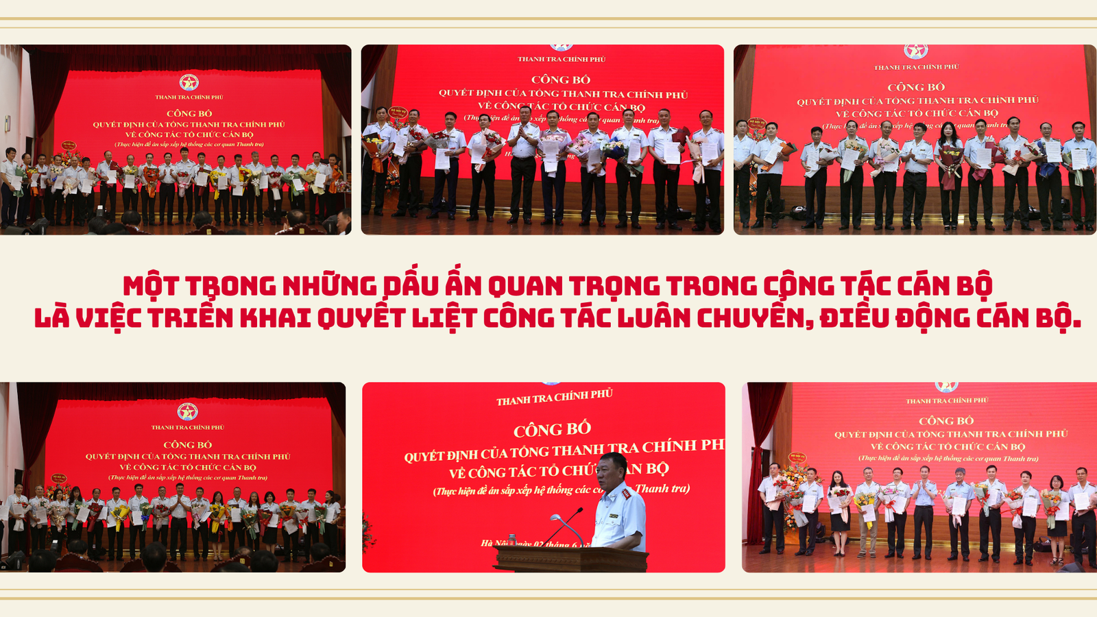 Một trong những dấu ấn quan trọng trong công tác cán bộ là việc triển khai quyết liệt công tác luân chuyển, điều động cán bộ. Ban Thường vụ Đảng ủy Thanh tra Chính phủ đã ban hành Nghị quyết số 68-NQ/BCSĐ ngày 15/3/2023 và Tổng Thanh tra Chính phủ đã ban hành Kế hoạch số 766/KH-TTCP về luân chuyển, điều động và chuyển đổi vị trí công tác công chức, viên chức Thanh tra Chính phủ giai đoạn 2023-2027.