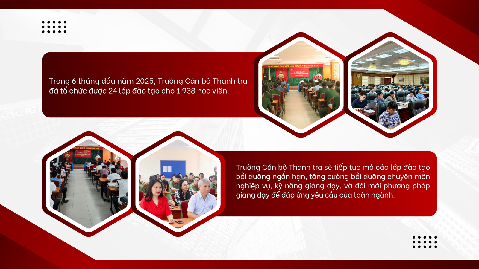 Để đáp ứng yêu cầu công việc trong tình hình mới, công tác đào tạo, bồi dưỡng cán bộ luôn được chú trọng. Điển hình, trong 6 tháng đầu năm 2025, Trường Cán bộ Thanh tra đã tổ chức được 24 lớp đào tạo cho 1.938 học viên, bao gồm các lớp thanh tra viên cao cấp, chính, và thanh tra viên, cũng như các lớp quốc tế và theo nhu cầu chuyên sâu. Hiệu trưởng Trường Cán bộ Thanh tra Nguyễn Văn Lương đã đề nghị tiếp tục tăng cường bồi dưỡng chuyên môn, nghiệp vụ, kỹ năng giảng dạy, đổi mới phương pháp giảng dạy và khung chương trình để phục vụ tốt công tác đào tạo trong thời gian tới.