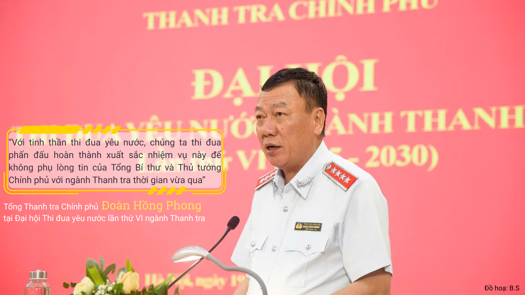 Phát biểu tại Đại hội, Tổng Thanh tra Chính phủ Đoàn Hồng Phong đã nhấn mạnh yêu cầu có tính hiệu triệu: Thanh tra Chính phủ phải hoàn thành việc thanh tra 70 dự án khó khăn, vướng mắc; thanh tra các tỉnh, thành phố phải hoàn thành 490 dự án còn tồn đọng kéo dài, có nguy cơ thất thoát, lãng phí. “Với tinh thần thi đua yêu nước, chúng ta thi đua phấn đấu hoàn thành xuất sắc nhiệm vụ này để không phụ lòng tin của Tổng Bí thư và Thủ tướng Chính phủ với ngành Thanh tra thời gian vừa qua”.