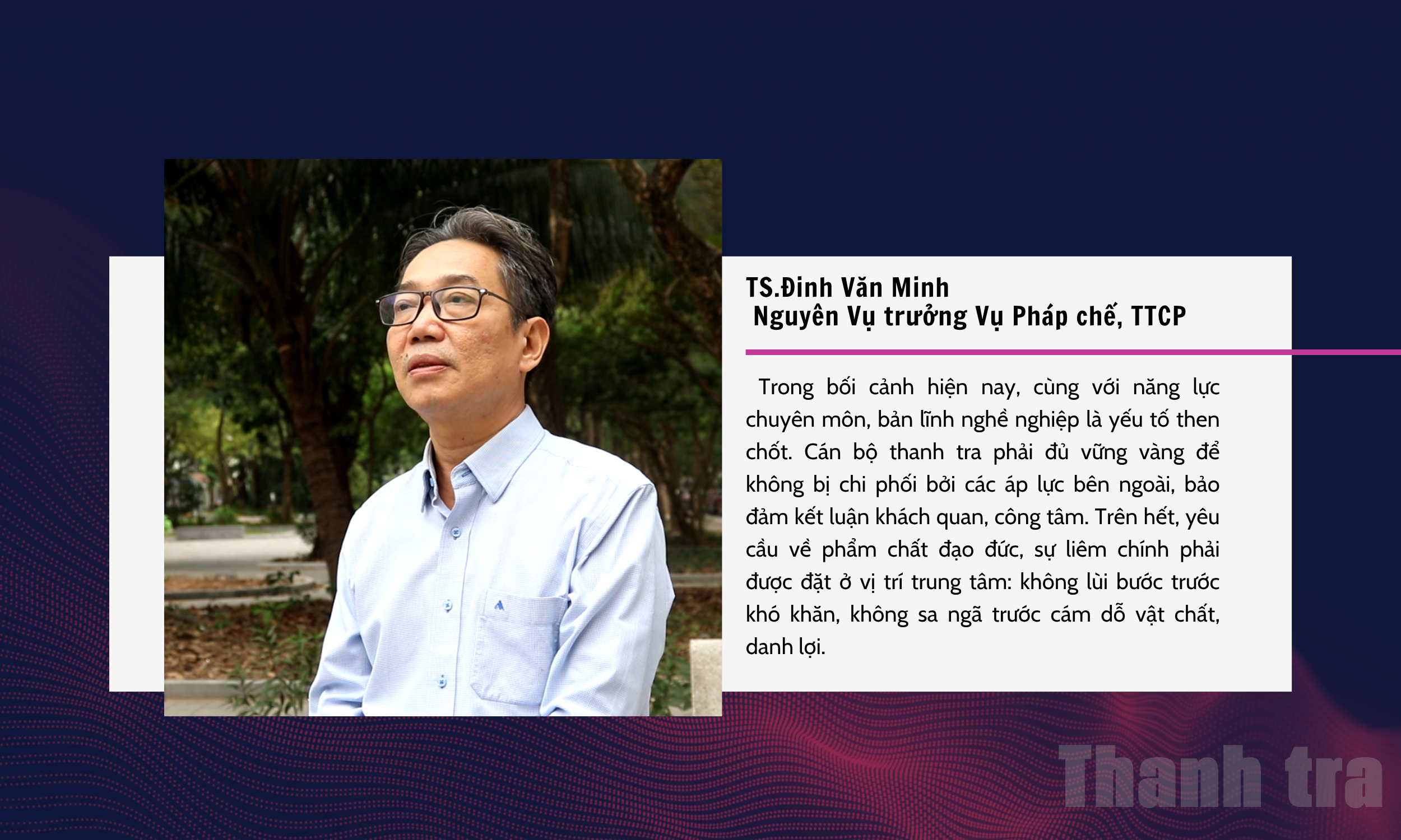 Cũng theo ông, cùng với năng lực chuyên môn, bản lĩnh nghề nghiệp là yếu tố then chốt. Cán bộ thanh tra phải đủ vững vàng để không bị chi phối bởi các áp lực bên ngoài, bảo đảm kết luận khách quan, công tâm. Trên hết, yêu cầu về phẩm chất đạo đức, sự liêm chính phải được đặt ở vị trí trung tâm: không lùi bước trước khó khăn, không sa ngã trước cám dỗ vật chất, danh lợi.
