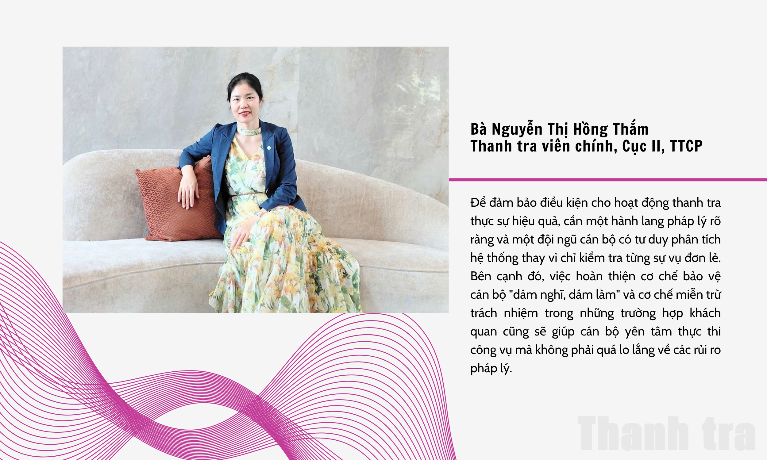 Để đảm bảo điều kiện cho hoạt động thanh tra thực sự hiệu quả, theo bà Thắm, cần một hành lang pháp lý rõ ràng và một đội ngũ cán bộ có tư duy phân tích hệ thống thay vì chỉ kiểm tra từng sự vụ đơn lẻ. Bên cạnh đó, bà cũng nhấn mạnh việc hoàn thiện cơ chế bảo vệ cán bộ "dám nghĩ, dám làm" và cơ chế miễn trừ trách nhiệm trong những trường hợp khách quan, giúp cán bộ yên tâm thực thi công vụ mà không phải quá lo lắng về các rủi ro pháp lý.