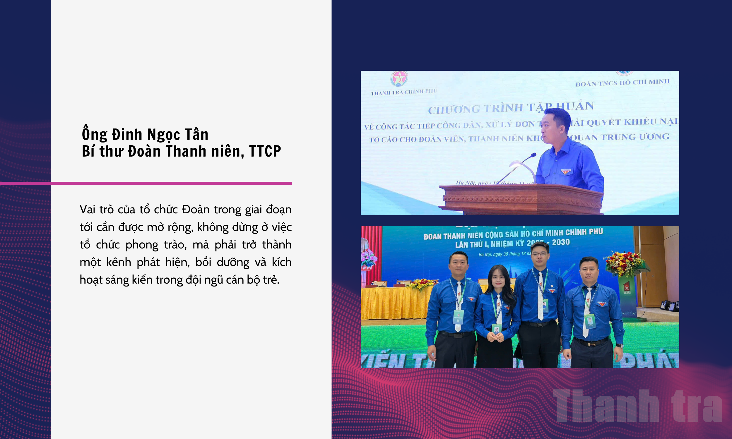 Trong lĩnh vực thanh tra, điều này càng có ý nghĩa khi yêu cầu về minh bạch, trách nhiệm giải trình và ứng dụng công nghệ ngày càng rõ. Thanh niên có thể đi đầu trong việc đề xuất các mô hình quản lý mới, góp phần nâng cao chất lượng xử lý công việc, đồng thời tạo ra những thay đổi có thể nhìn thấy trong thực tiễn. Khi thanh niên không chỉ là lực lượng thực thi mà trở thành lực lượng kiến tạo, thì tinh thần đổi mới của nhiệm kỳ mới mới thực sự được hiện thực hóa.