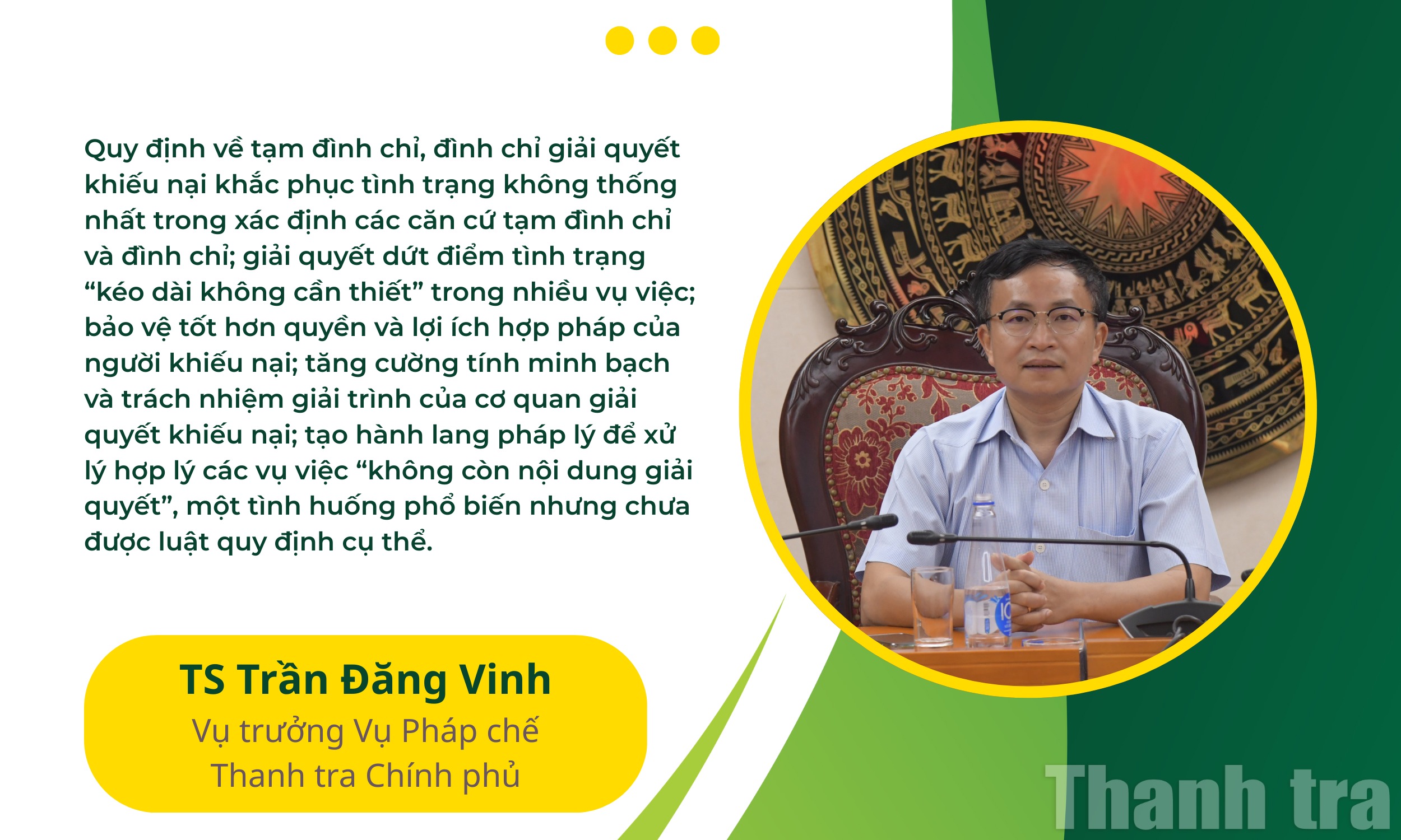 + PV: Quy định về tạm đình chỉ, đình chỉ giải quyết khiếu nại được sửa đổi để rõ ràng và chặt chẽ hơn. Từ góc nhìn cơ quan soạn thảo, chính sách này sẽ khắc phục những bất cập nào trong thực tiễn thời gian qua, thưa ông?