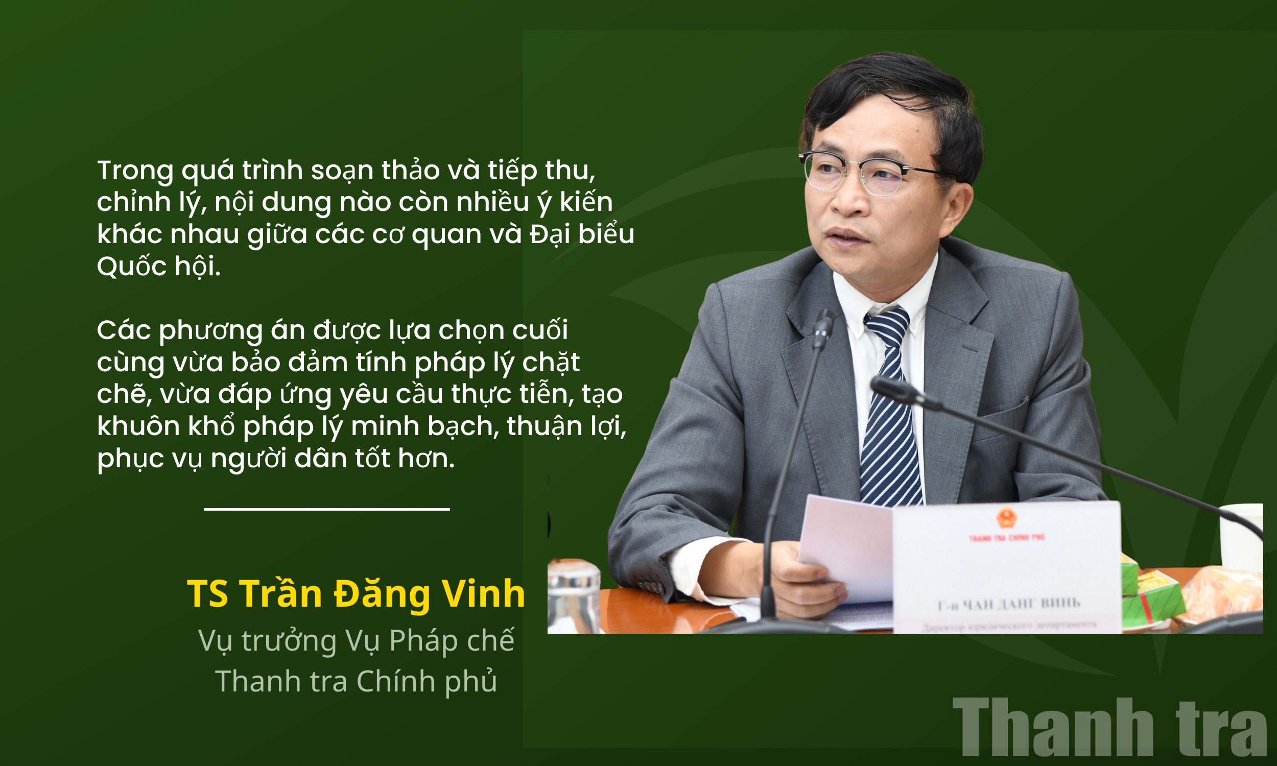 Để giúp bạn đọc hiểu rõ hơn về những điểm mới quan trọng, tác động của các chính sách này trong thực tiễn, cũng như những vấn đề đặt ra trong quá trình xây dựng, tiếp thu và hoàn thiện dự án Luật, Báo Thanh tra đã có cuộc trao đổi với TS Trần Đăng Vinh, Vụ trưởng Vụ Pháp chế, Thanh tra Chính phủ - người trực tiếp tham mưu xây dựng dự án Luật.