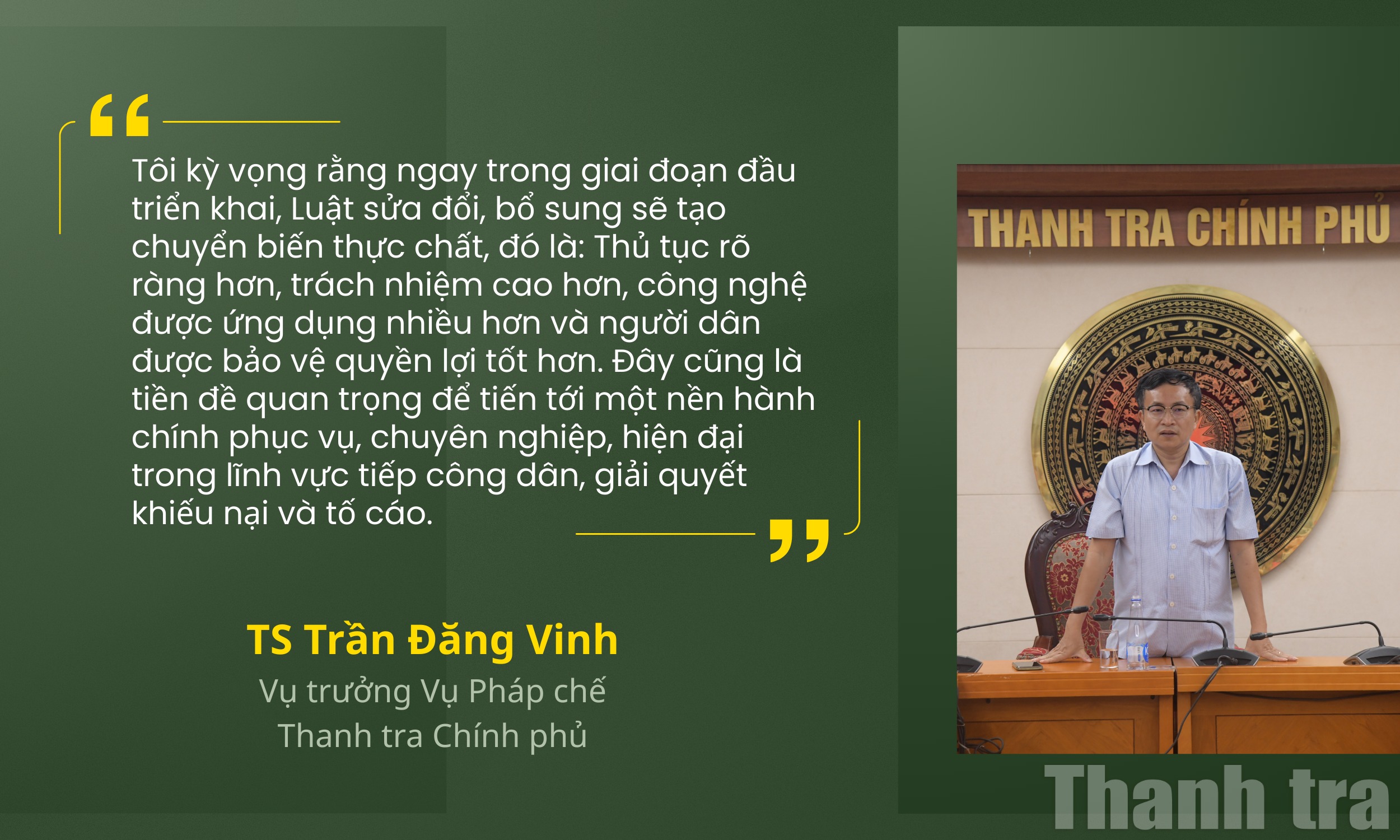 - TS Trần Đăng Vinh: Việc sửa đổi đồng thời 3 luật: Luật Tiếp công dân, Luật Khiếu nại và Luật Tố cáo có ý nghĩa rất lớn đối với hiệu quả quản lý nhà nước, bởi đây là 3 lĩnh vực có mối quan hệ chặt chẽ, tác động trực tiếp đến quyền, lợi ích hợp pháp của người dân và trách nhiệm của các cơ quan công quyền.