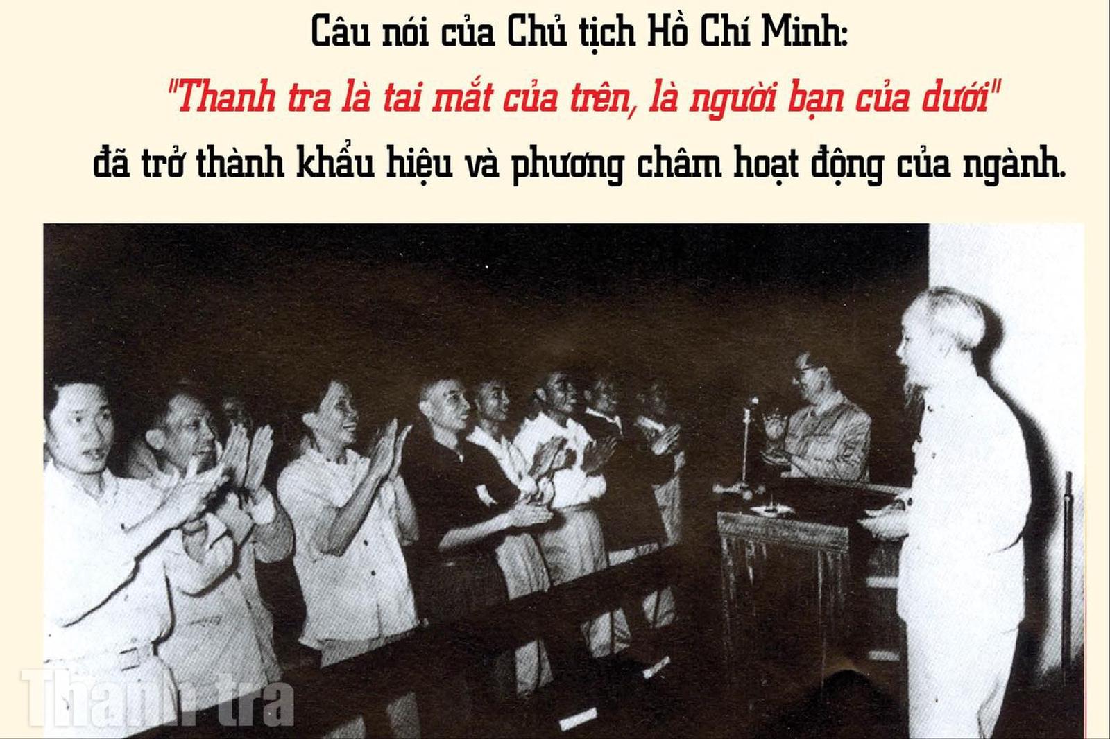 Câu nói của Người với cán bộ thanh tra tại hội nghị năm 1957: "Thanh tra là tai mắt của trên, là người bạn của dưới" đã trở thành khẩu hiệu và phương châm hoạt động của toàn ngành trong suốt chiều dài lịch sử vẻ vang.