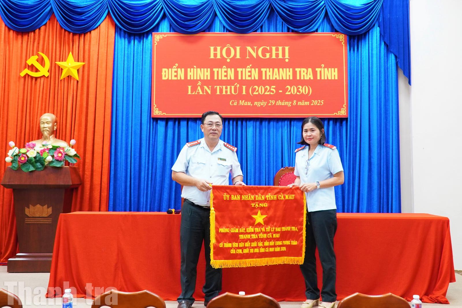 Chánh Thanh tra tỉnh Cà Mau Nguyễn Minh Phụng trao cờ thi đua của UBND tỉnh cho Phòng Nghiệp vụ 4. Ảnh: Chu Tuấn