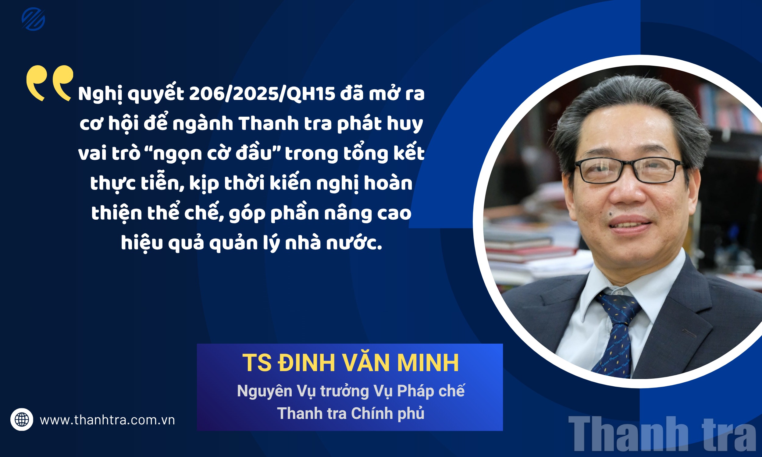 Trao đổi với phóng viên Báo Thanh tra, TS Đinh Văn Minh, nguyên Vụ trưởng Vụ Pháp chế (Thanh tra Chính phủ) cho rằng, Nghị quyết 206/2025/QH15 (Nghị quyết 206) đã mở ra cơ hội để ngành Thanh tra phát huy vai trò “ngọn cờ đầu” trong tổng kết thực tiễn, kịp thời kiến nghị hoàn thiện thể chế, góp phần nâng cao hiệu quả quản lý Nhà nước.
