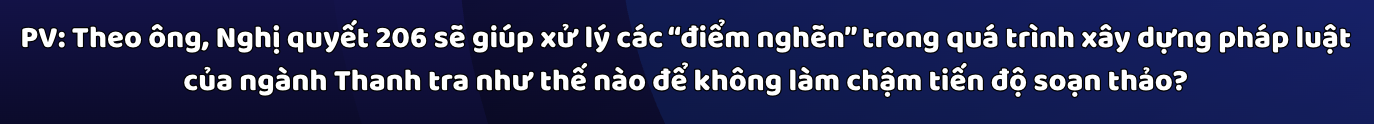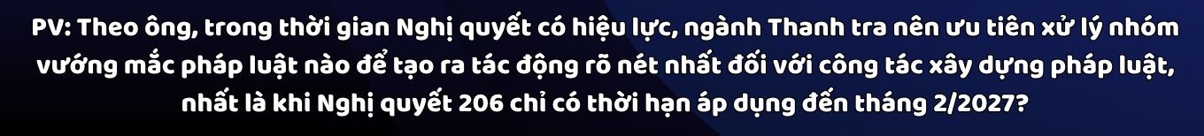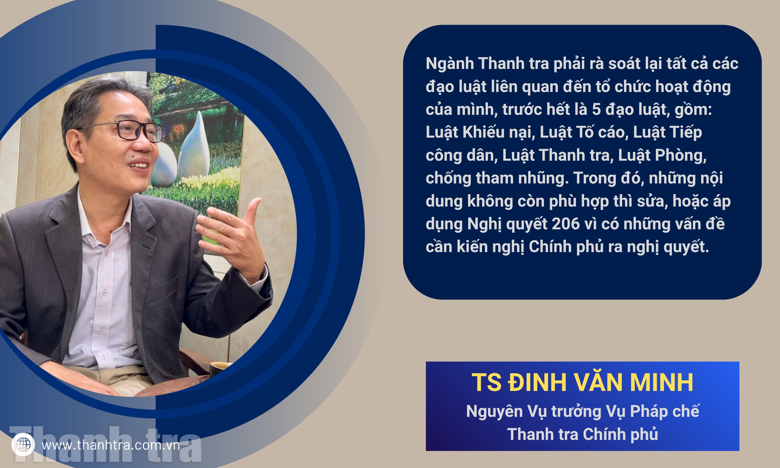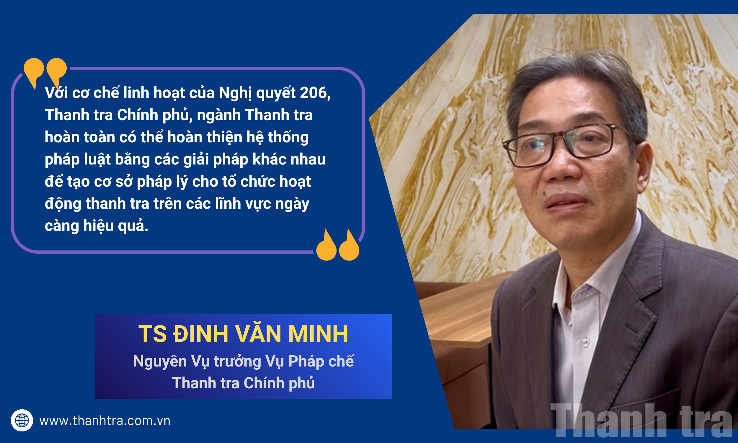 - TS Đinh Văn Minh: Nghị quyết 206 đã chỉ ra nhiều giải pháp với các cấp độ khác nhau. Thứ nhất là sửa đổi, tức là bản thân ngành Thanh tra sẽ đề nghị Chính phủ ở cấp độ luật thì đề nghị sửa luật, sửa nghị quyết; việc sửa luật, nghị quyết hiện nay cũng có quy trình rút gọn. Thứ hai, trong trường hợp “chưa chín, chưa tới”thì chúng ta có thể đề nghị Chính phủ ban hành nghị quyết quy phạm trong lúc chờ sửa luật.