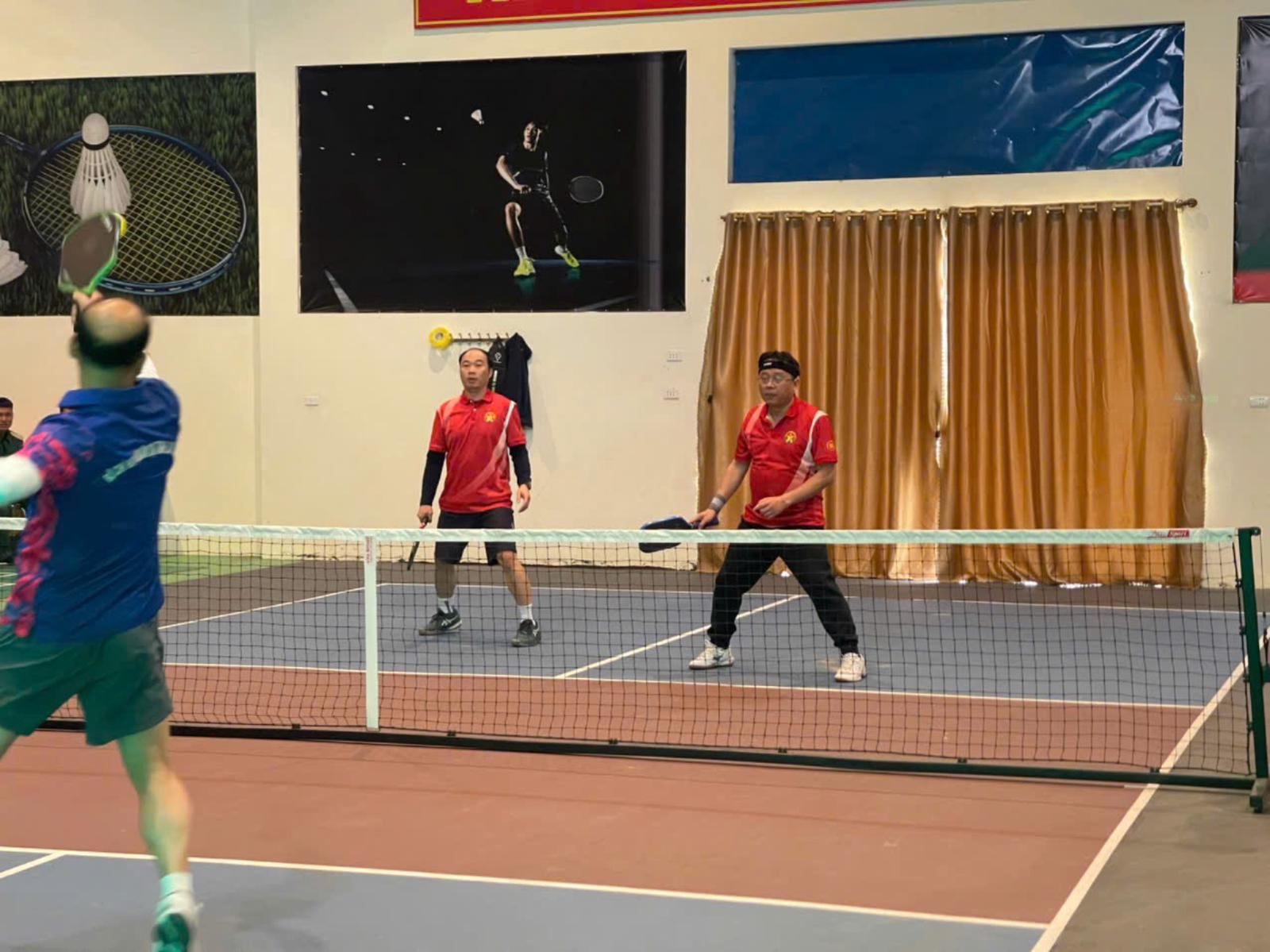 Cặp đôi Lãnh đạo Thanh tra tỉnh Lai Châu (áo đỏ) thi đấu với tinh thần đoàn kết, trách nhiệm tại Giải Pickleball Khối thi đua Nội chính tỉnh. Ảnh: Văn Phòng