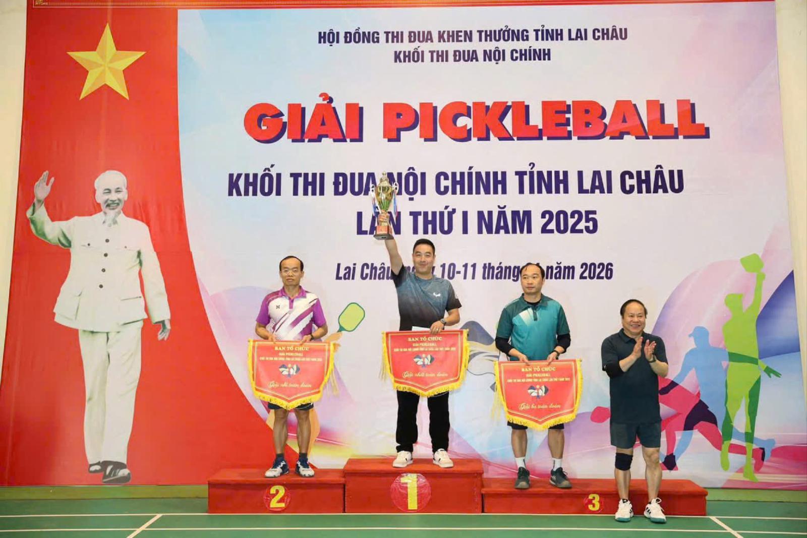 Sau 2 ngày thi đấu (10-11/1/2026), Giải Pickleball Khối thi đua Nội chính tỉnh Lai Châu lần thứ nhất năm 2025 đã diễn ra thành công tốt đẹp. Giải thu hút 64 vận động viên là cán bộ, công chức, viên chức, chiến sĩ lực lượng vũ trang và người lao động đến từ 7 đội tuyển thuộc các cơ quan, đơn vị thành viên trong Khối thi đua Nội chính tỉnh. Giải được tổ chức thành 2 nhóm thi đấu, gồm nhóm lãnh đạo và nhóm phong trào; trong mỗi nhóm, các vận động viên tranh tài ở các nội dung đôi nam, đôi nữ và đôi nam – nữ phối hợp.