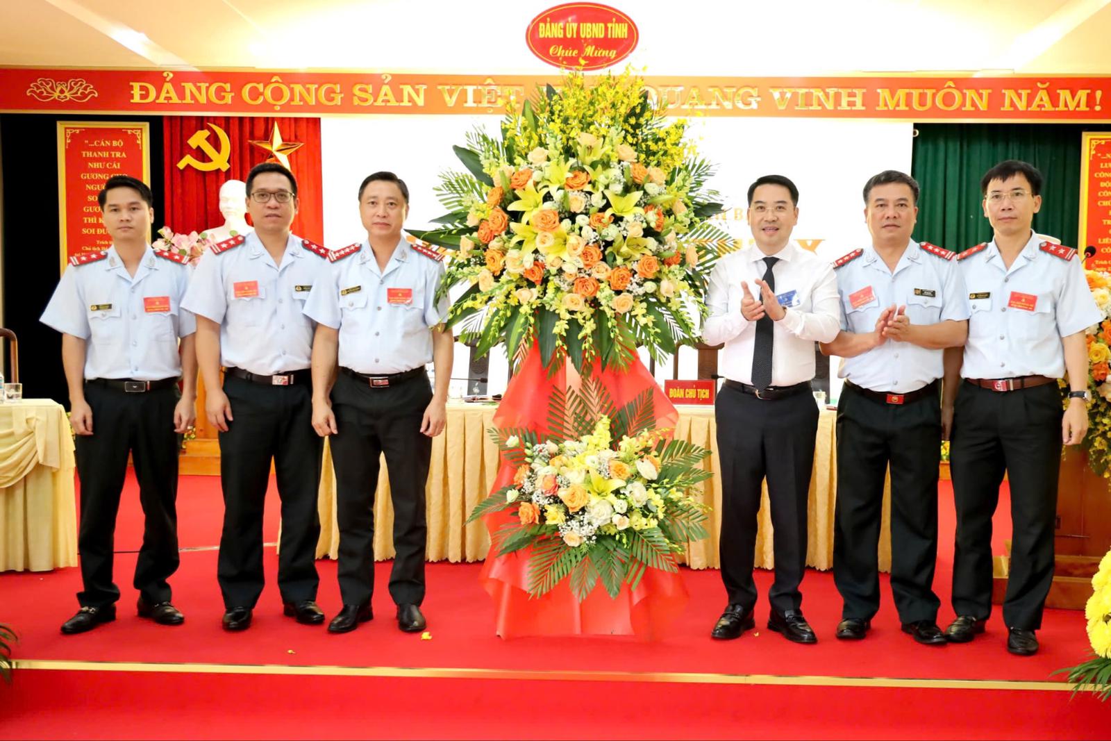 Chủ tịch UBND tỉnh Yên Bái Nguyễn Tuấn Anh (thứ 3, từ phải sang) tặng hoa chúc mừng Đại hội Đảng bộ Thanh tra tỉnh lần thứ X, nhiệm kỳ 2025 - 2030. Ảnh: Bùi Bình