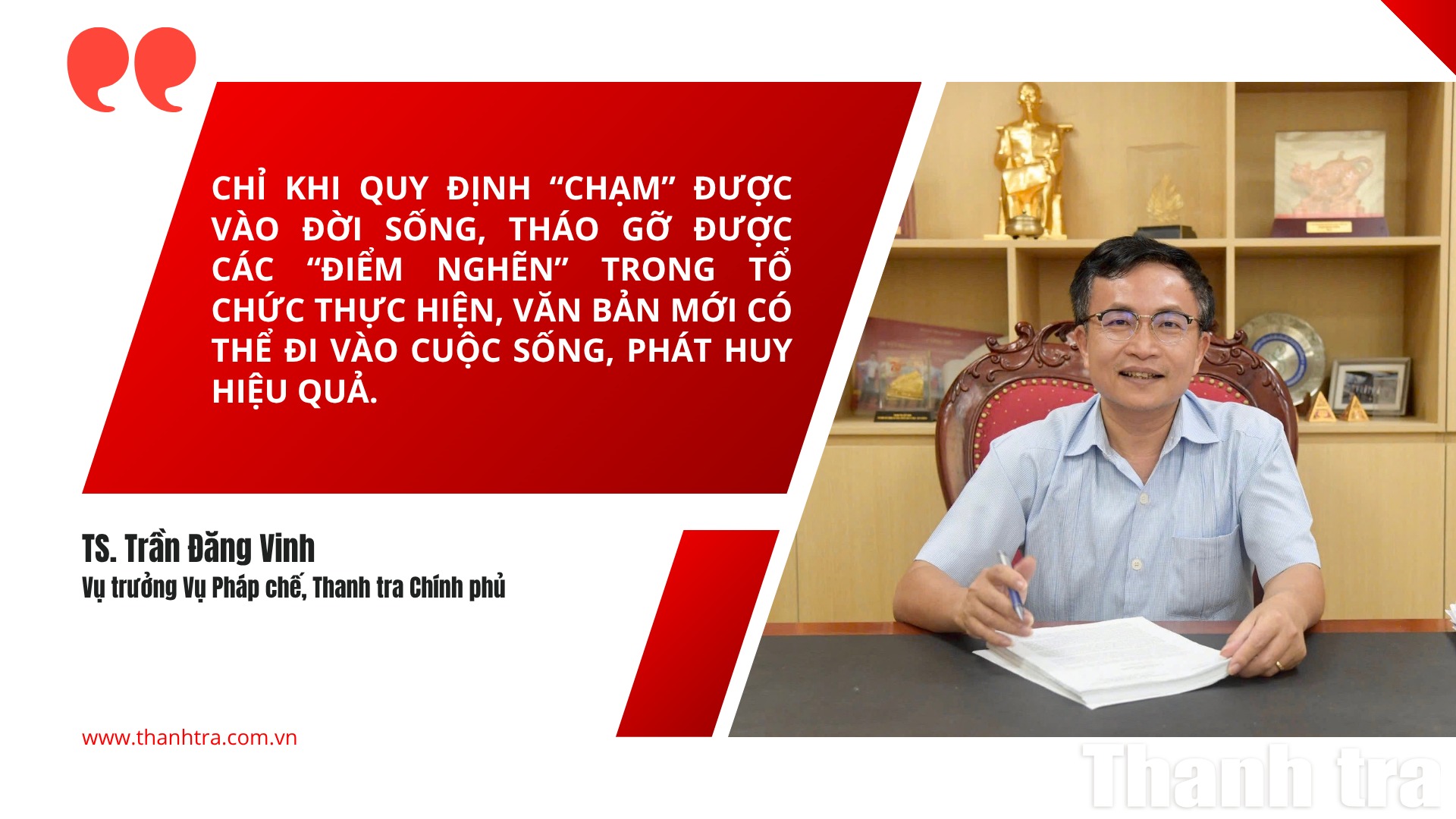 Bên cạnh đó, mỗi văn bản pháp luật phải xuất phát từ thực tiễn, từ yêu cầu quản lý và những vấn đề nảy sinh trong hoạt động thanh tra, tiếp công dân, giải quyết khiếu nại, tố cáo, phòng chống tham nhũng, tiêu cực. “Chỉ khi quy định “chạm” được vào đời sống, tháo gỡ được các “điểm nghẽn” trong tổ chức thực hiện, văn bản mới có thể đi vào cuộc sống, phát huy hiệu quả”, TS Trần Đăng Vinh phân tích.
