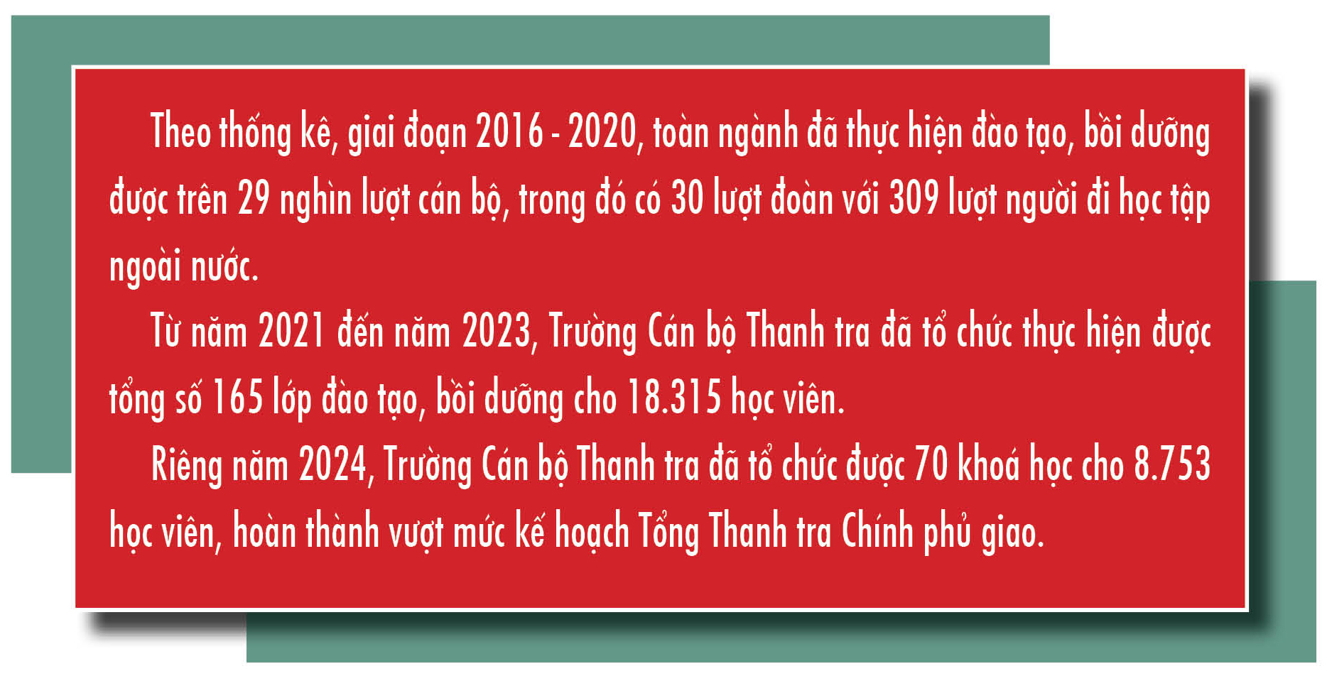 Bên cạnh đó, chương trình, tài liệu, giáo trình đào tạo, bồi dưỡng được rà soát, cập nhật và đổi mới theo hướng tích cực, tập trung bồi dưỡng kỹ năng làm việc và kinh nghiệm thực tiễn về thanh tra, tiếp công dân, giải quyết khiếu nại, tố cáo và phòng, chống tham nhũng, từ đó góp phần nâng cao chất lượng đội ngũ cán bộ, công chức ngành Thanh tra.