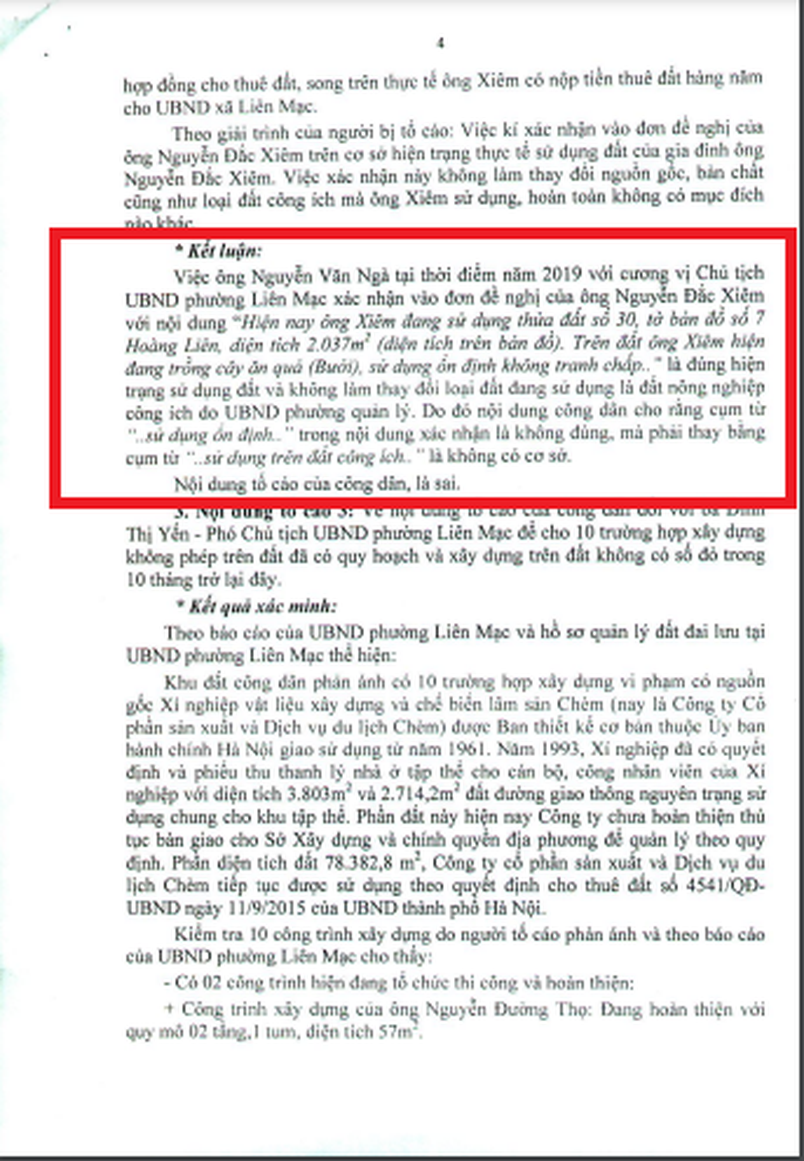 Với 2 nội dung tố cáo nguyên Chủ tịch UBND phường Liên Mạc Nguyễn Văn Ngà đã xác nhận không đúng nguồn gốc đất công ích cho ông Nguyễn Đắc Xiêm và Phó Chủ tịch UBND phường Liên Mạc Đinh Thị Yến để cho 10 trường hợp xây dựng không phép trên đất đã có quy hoạch và xây trên đất không có sổ đỏ trong 10 tháng trở lại đây, Kết luận 78 đều khẳng định nội dung tố cáo của công dân là sai hoặc chỉ đúng một phần.