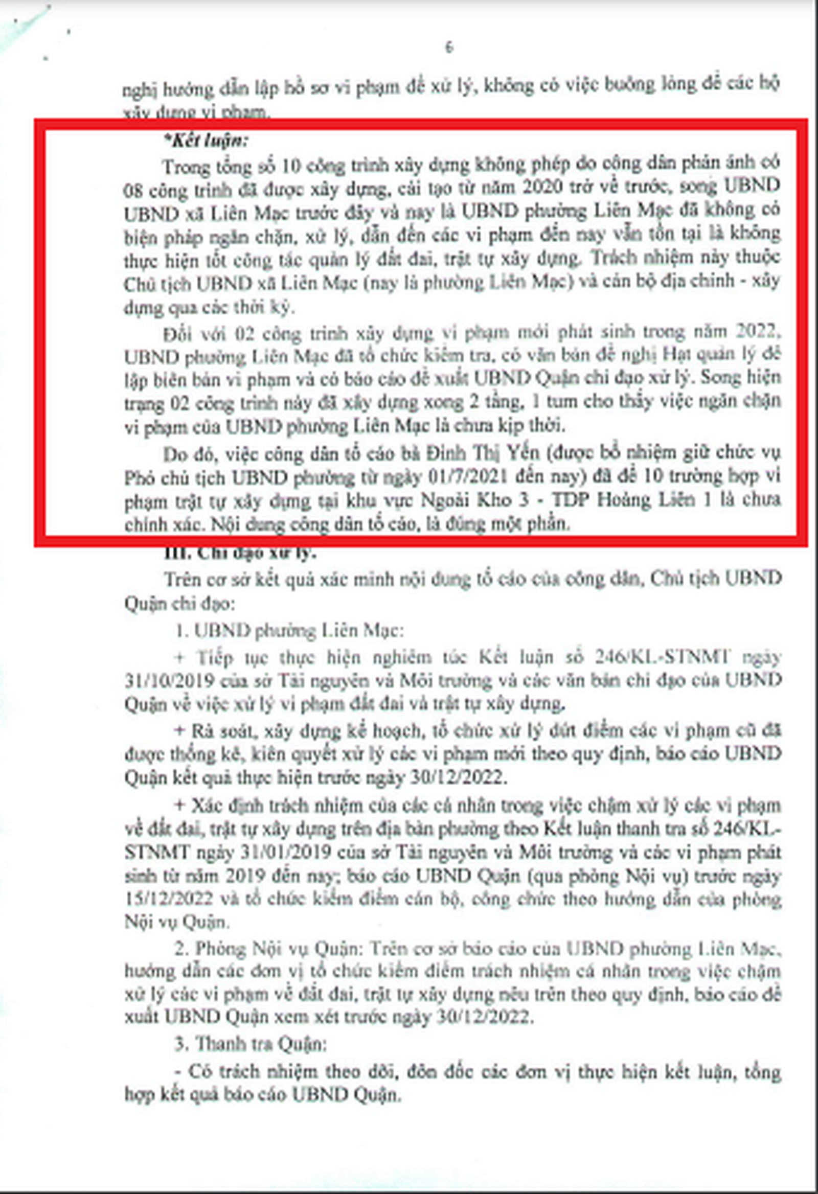 Đối với nội dung tố cáo bà Đinh Thị Yến, Kết luận 78 cho biết trong 10 trường hợp vi phạm bị tố cáo thì có tới 8 trường hợp phát sinh từ năm 2020 về trước và 2 trường hợp mới phát sinh năm 2022 trong khi bà Yến mới được bộ nhiệm từ ngày 01/7/2021 nên nội dung tố cáo bà Yến đã để 10 trường hợp vi phạm trật tự xây dựng tại khu vực Ngoài Kho 3, tổ dân phố Hoàng Liên 1 là chưa chính xác. Nội dung tố cáo đúng một phần.