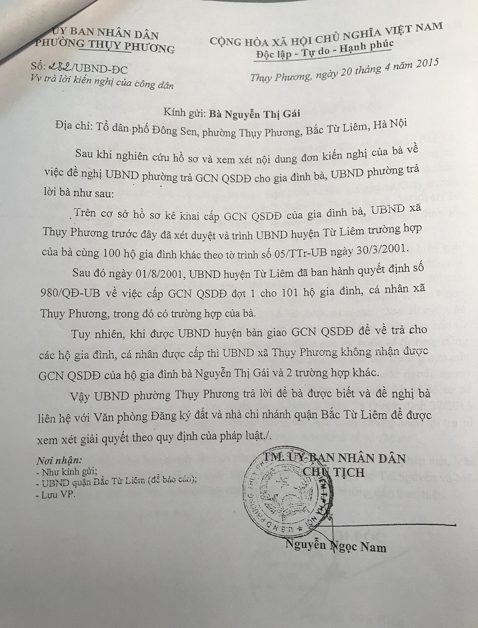 Công văn số 282 năm 2015 của Chủ tịch UBND phường Thụy Phương Nguyễn Ngọc Nam khẳng định chỉ có 3 trường hợp chưa trả GCNQSDĐ cấp năm 2001 nay lại phát sinh trường hợp thứ 4 của ông Nguyễn Thành Phố