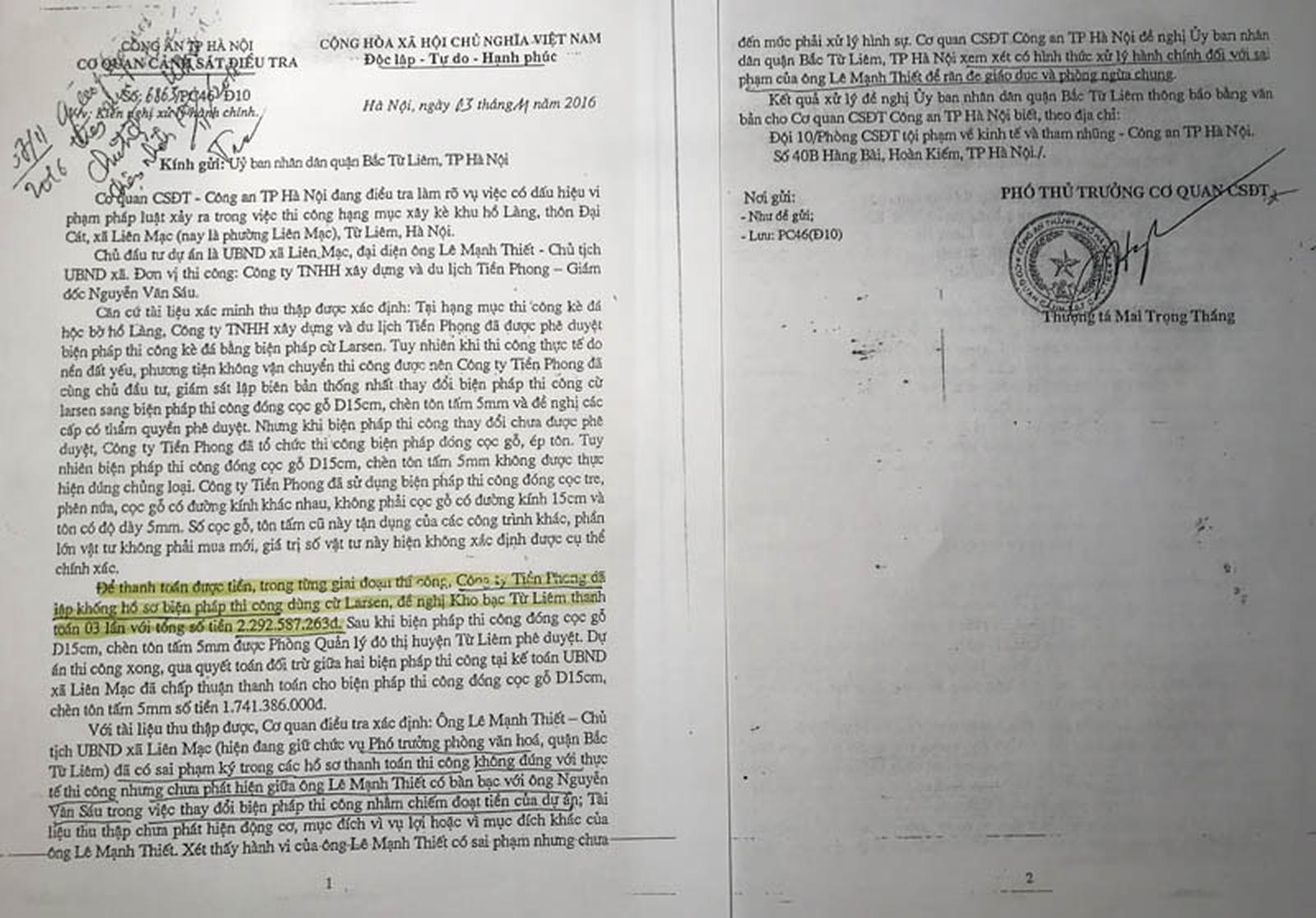 Vụ việc này được PC46 Công an TP Hà Nội (nay là PC03) khẳng định trong Văn bản số 6863/PC46-Đ10 ngày 3/11/2016. Theo đó, việc lập khống hồ sơ, với 3 lần đề nghị Kho bạc Nhà nước huyện Từ Liêm thanh toán, đã giúp Công ty TNHH Xây dựng và Du lịch Tiền Phong (Công ty Tiền Phong) rút ra 2.292.587.263 đồng. Thế nhưng, vụ án không được khởi tố và ông Lê Mạnh Thiết, cựu Chủ tịch UBND xã Liên Mạc chỉ bị đề nghị xử lí hành chính.