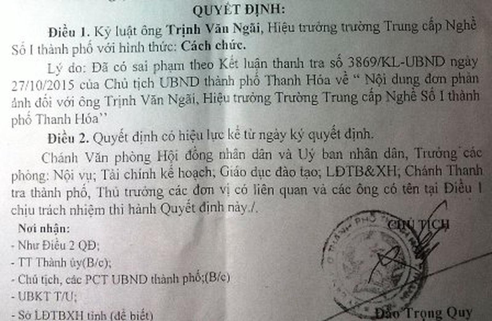 Kết quả, ông Trịnh Văn Ngãi, Hiệu trưởng Trường Trung cấp nghề số 1 Thanh Hóa phải nhận hình thức kỷ luật cách chức.