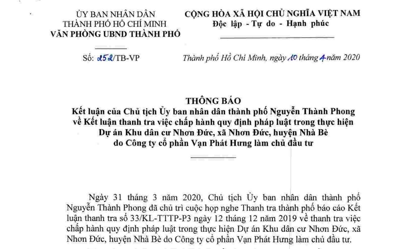 Sau khi Thanh tra TP ban hành Kết luận thanh tra số 33/KL-TTTP-P3 ngày 12/12/2019 về thanh tra việc chấp hành các quy định pháp luật trong thực hiện Dự án Khu dân cư Nhơn Đức do Cty Vạn Phát Hưng làm chủ đầu tư, ngày 31/3/2020, Chủ tịch UBND TP đã có buổi họp nghe báo cáo những nội dung tại kết luận thanh tra.