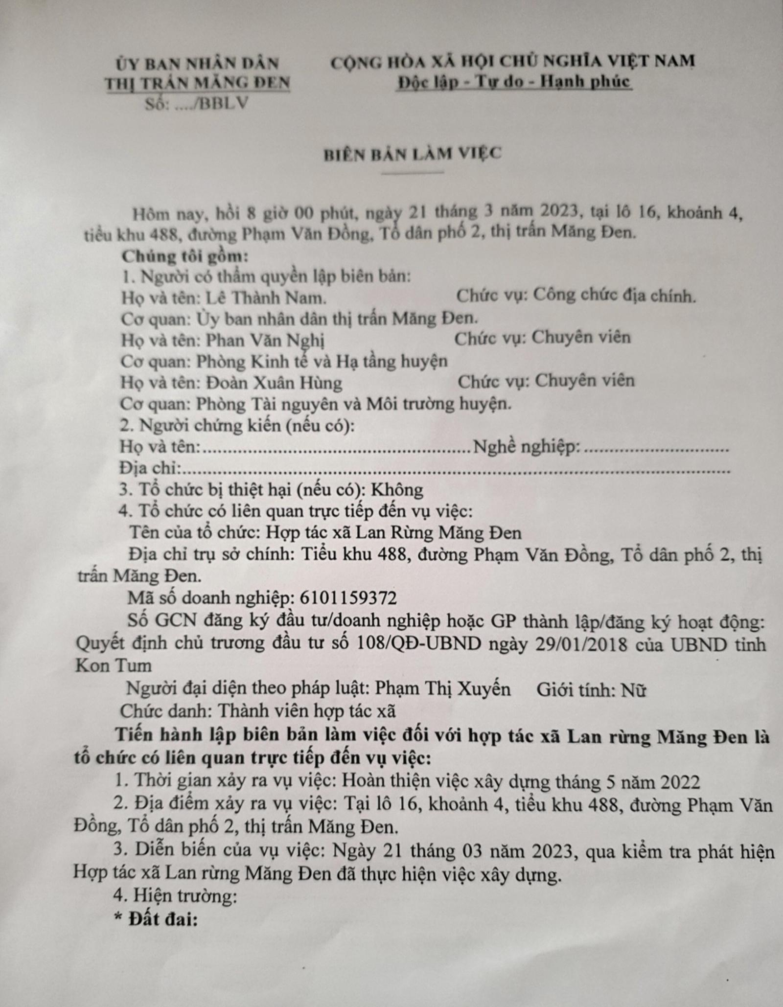 Đến ngày 21/3/2023, UBND thị trấn Măng Đen chủ trì cùng đại diện Phòng KT-HT, Phòng TN&MT huyện lập biên bản làm việc với bà Phan Thị Xuyến, thành viên HTX Lan rừng Măng Đen về nội dung: Công trình xây dựng hoàn thiện tháng 5/2022, tại lô số 16, khoảnh 4, tiểu khu 488, tổ dân phố số 2, đường Phạm Văn Đồng, thị trấn Măng Đen, huyện Kon Plông, Kon Tum.