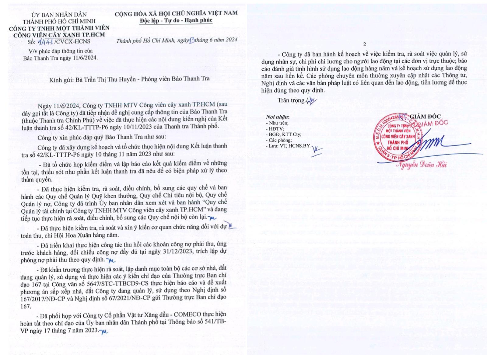 Ngày 13/6/2024, Công ty Công viên cây xanh TP đã có Công văn số 1441/CVCX-HCNS về việc phúc đáp thông tin của Báo Thanh tra. Theo đó, Công ty đã xây dựng kế hoạch và tổ chức thực hiện các nội dung kiến nghị tại Kết luận thanh tra số 42/KL-TTTP-P6 của Thanh tra TP.