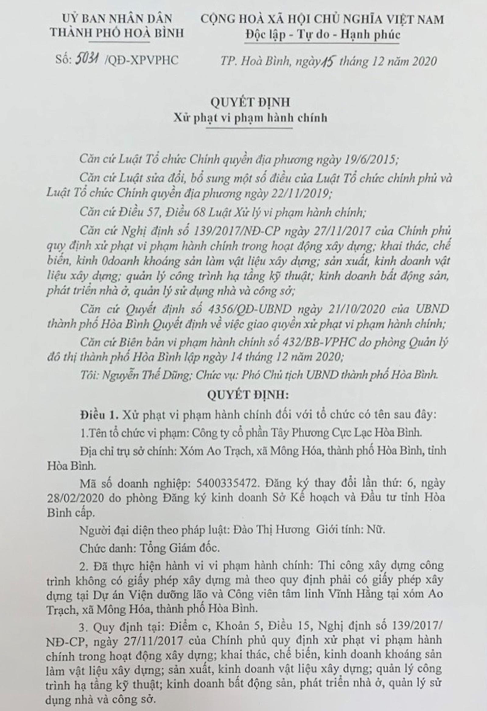 Ngày 15/12/2020, UBND TP Hòa Bình ban hành Quyết định số 5031/QĐ-XPVPHC xử phạt vi phạm hành chính 40 triệu đồng đối với Công ty CP Tây phương cực lạc Hòa Bình do xây dựng Dự án Viện Dưỡng lão và Công viên Tâm linh Vĩnh Hằng tại xóm Ao Trạch, xã Mông Hóa, TP Hòa Bình không có giấy phép xây dựng.