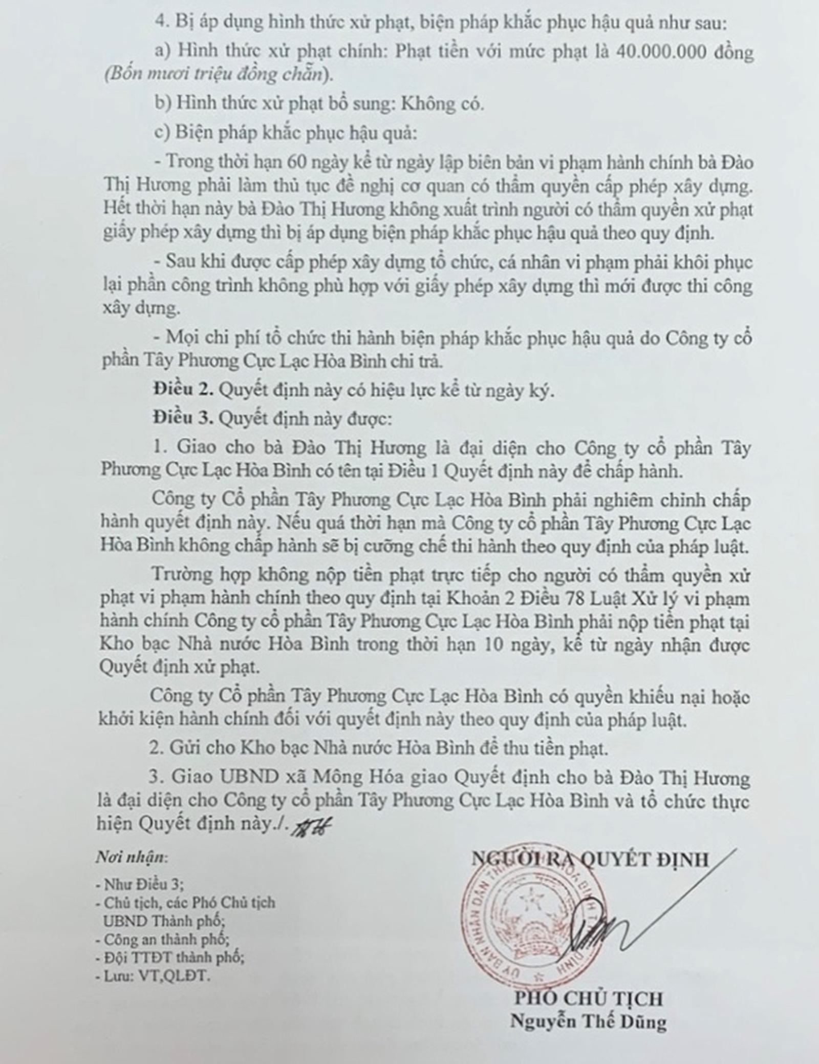 UBND TP Hòa Bình yêu cầu, trong thời hạn 60 ngày kể từ ngày lập biên bản vi phạm hành chính (ngày 14/12/2020), bà Đào Thị Hương, Tổng Giám đốc Công ty CP Tây phương cực lạc Hòa Bình phải làm thủ tục đề nghị cơ quan có thẩm quyền cấp phép xây dựng. Hết thời hạn này, bà Đào Thị Hương không xuất trình người có thẩm quyền xử phạt giấy phép xây dựng, thì bị áp dụng biện pháp khắc phục hậu quả theo quy định.