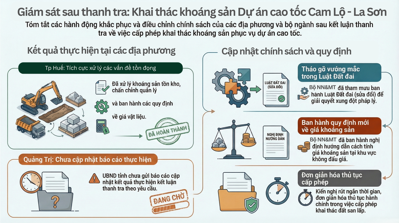 (Thanh tra) - Thanh tra Chính phủ vừa có Văn bản số 3196/BC-TTCP ngày 8/12/2025 báo cáo Phó Thủ tướng Thường trực Chính phủ Nguyễn Hòa Bình về kết quả theo dõi, đôn đốc việc thực hiện Kết luận thanh tra số 1782/KL-TTCP ngày 4/8/2023 của Thanh tra Chính phủ về thanh tra việc cấp phép khai thác khoáng sản làm vật liệu xây dựng thông thường tại các tỉnh Quảng Bình, Quảng Trị, Thừa Thiên - Huế (cũ) để cung cấp cho Dự án thành phần đầu tư xây dựng đoạn Cam Lộ - La Sơn.