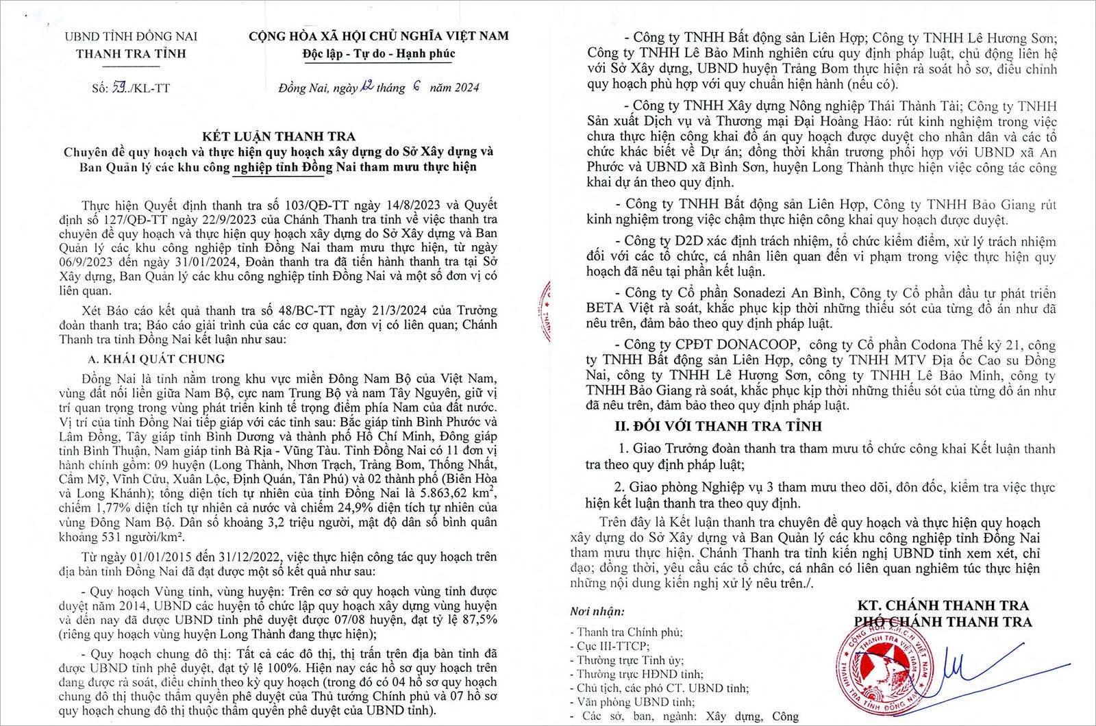 Nhiều đơn vị được giao thực hiện các nội dung liên quan đến Kết luận thanh tra số 59/KL-TT ngày 12/6/2024 của Thanh tra tỉnh như: Sở Xây dựng; Sở Nông nghiệp và Môi trường; Ban Quản lý Các khu công nghiệp, khu kinh tế tỉnh; Tổng Công ty Cổ phần Phát triển khu công nghiệp và UBND các xã, phường: Biên Hòa, Trấn Biên, Trảng Bom, Hưng Thịnh, An Phước, Long Phước, Long Thành…