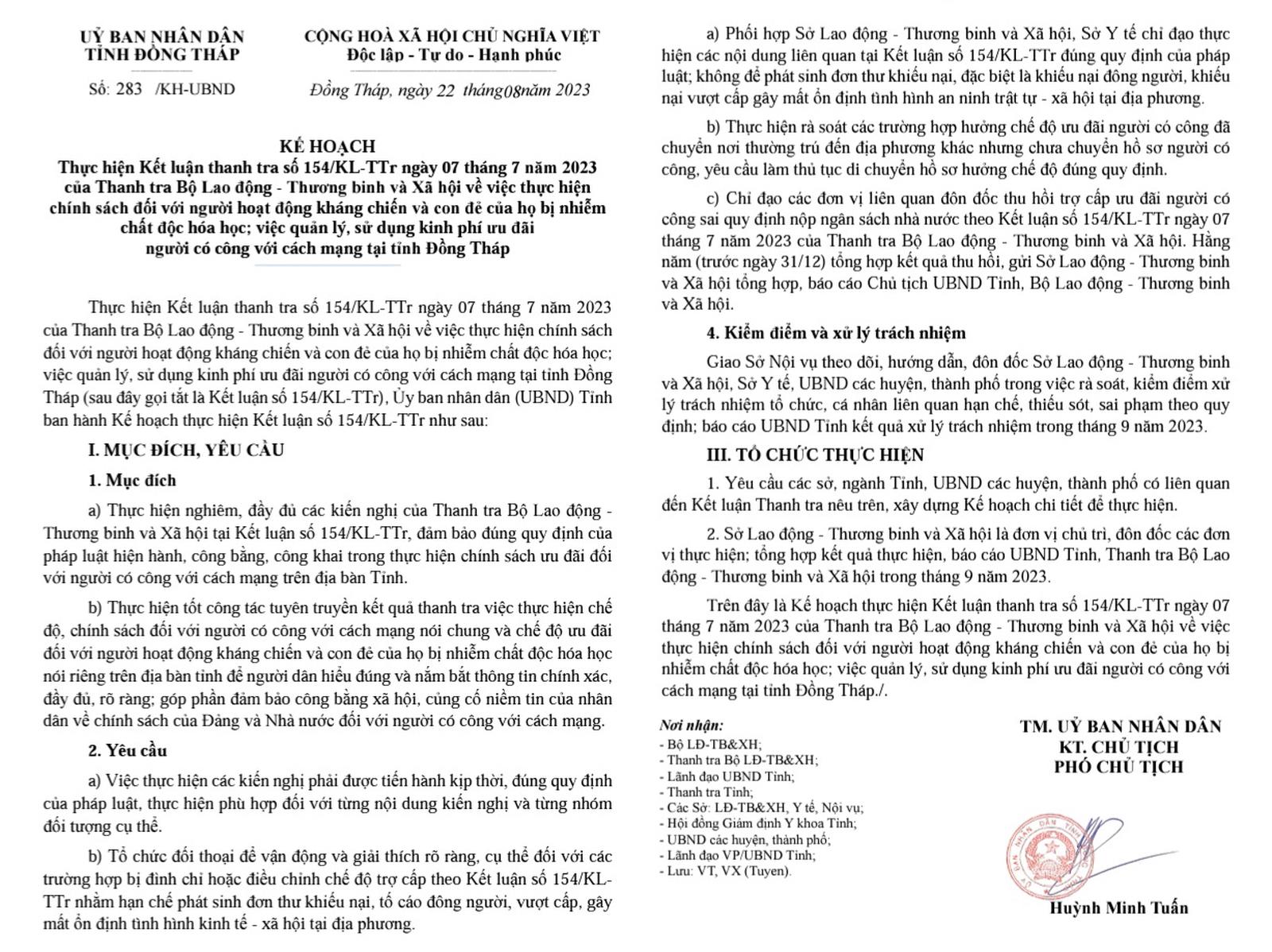 (Thanh tra) - Ngày 22/8/2023, UBND tỉnh Đồng Tháp đã ban hành kế hoạch thực hiện Kết luận thanh tra (KLTT) số 154/KL-TTr ngày 7/7/2023 của Thanh tra Bộ Lao động - Thương binh và Xã hội (LĐ-TB&XH) về việc thực hiện chính sách đối với người hoạt động kháng chiến và con đẻ của họ bị nhiễm chất độc hóa học; việc quản lý, sử dụng kinh phí ưu đãi người có công với cách mạng tại tỉnh.