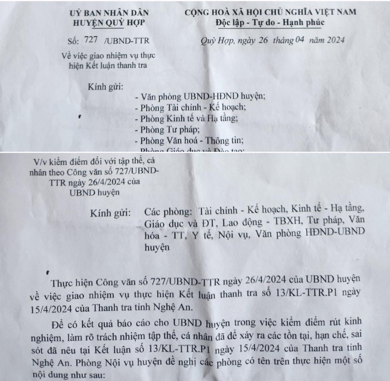 Sau khi Chủ tịch UBND huyện ban hành công văn giao nhiệm vụ thực hiện kết luận thanh tra, ngày 3/5/2024, Trưởng phòng Nội vụ, UBND huyện Quỳ Hợp đã ban hành văn bản về việc kiểm điểm đối với tập thể, cá nhân để xảy ra các tồn tại, hạn chế, sai sót đã nêu.