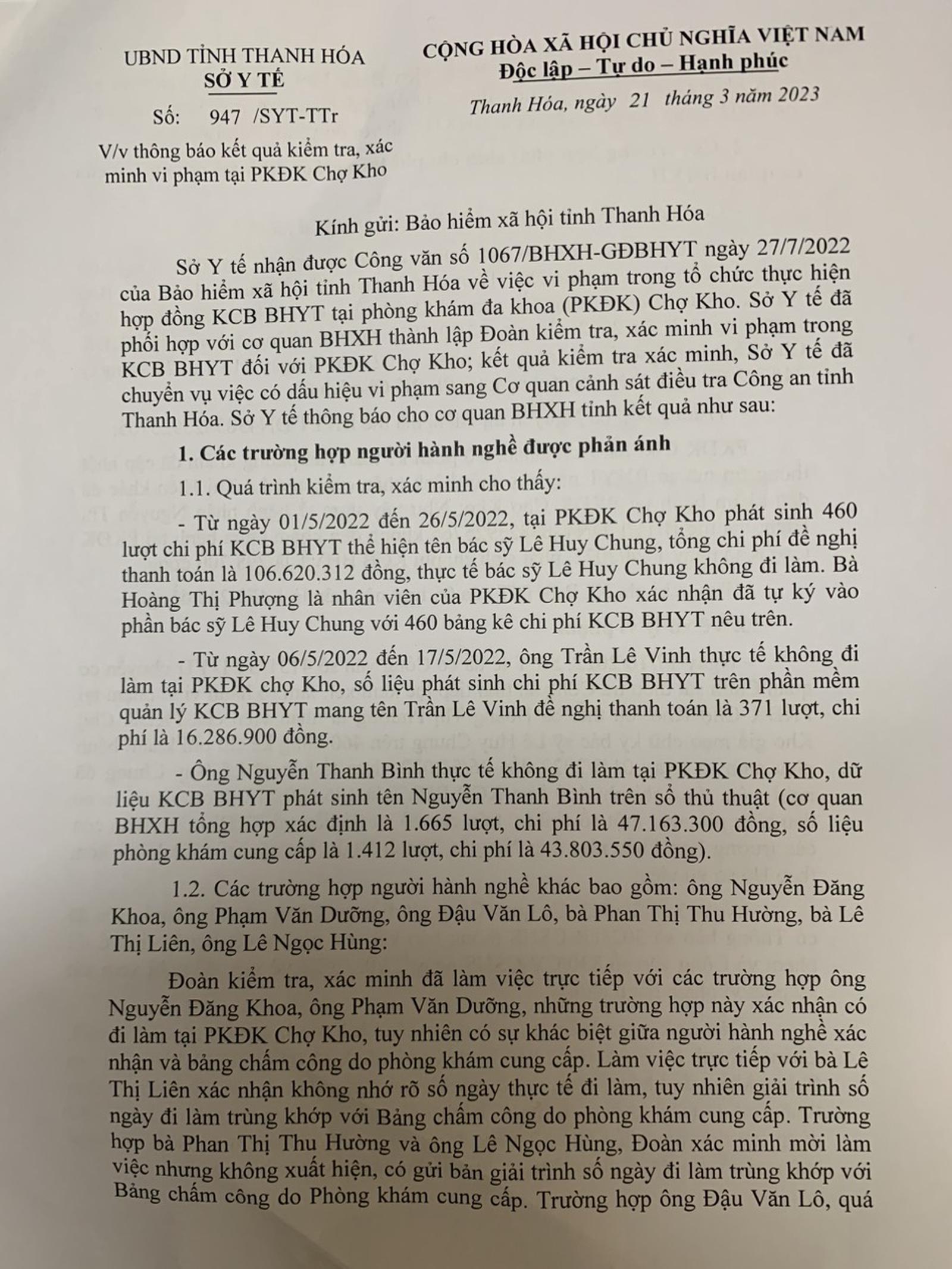 Từ những kết quả xác minh tại Phòng khám Đa khoa Chợ Kho, Sở Y tế tỉnh Thanh Hóa xác định, bà Hoàng Thị Phượng là nhân viên của Phòng khám Đa khoa Chợ Kho đã giả mạo chữ ký của bác sĩ Lê Huy Chung trên 460 bảng kê chi phí khám bệnh phát sinh từ ngày 1/5/2022 đến 26/5/2022; có dấu hiệu giả mạo một số chữ ký trên các hồ sơ tài liệu tại Phòng khám Đa khoa Chợ Kho của các trường hợp khác như ông Nguyễn Thanh Bình, bác sĩ Trần Lê Vinh.