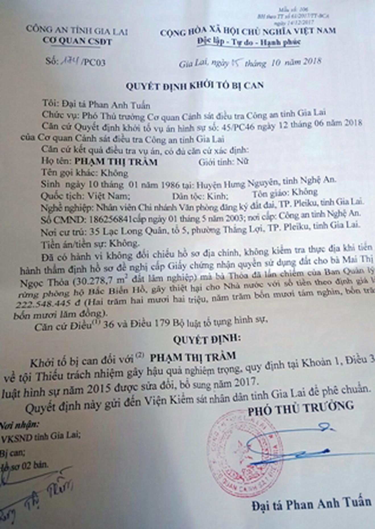 Quyết định khởi tố bị can đối với bà Trầm. Ảnh: Lương Ý