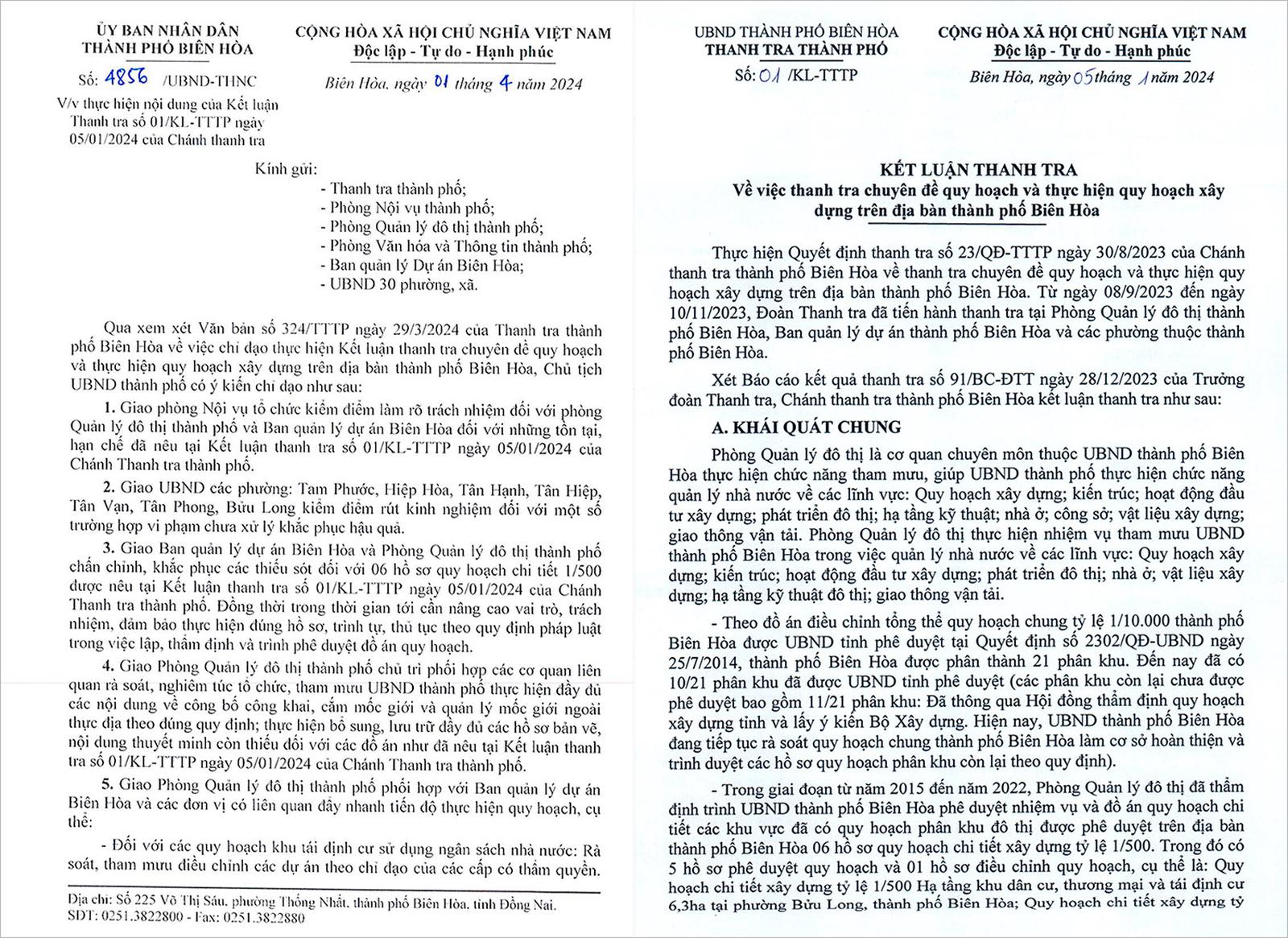 Ngày 01/04/2024, UBND TP Biên Hòa ban hành Văn bản số 4856/UBND-THNC về việc thực hiện kết luận thanh tra.