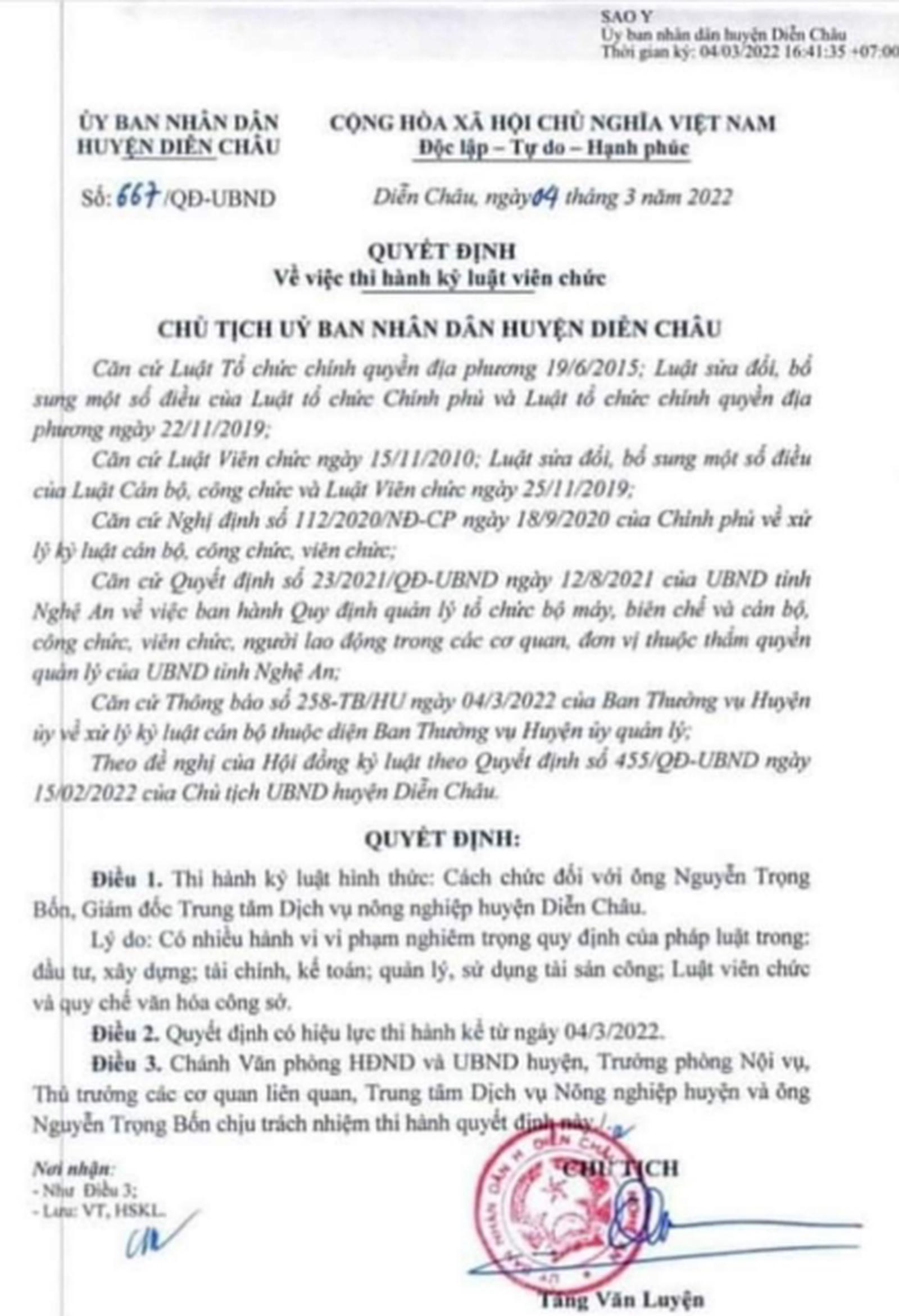 Quyết định thi hành kỷ luật của UBND huyện Diễn Châu. Ảnh: Xuân Thống