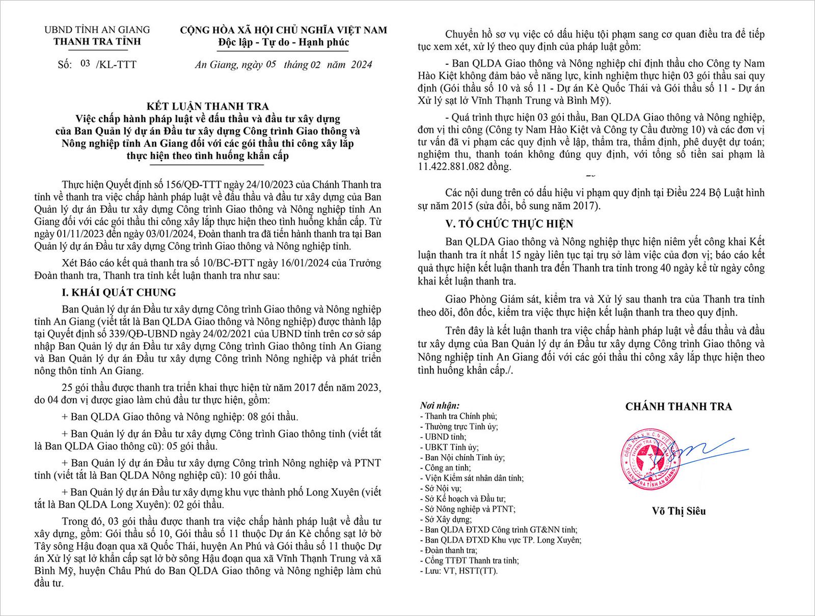 Theo Kết luận thanh tra số 03/KL-TTT ngày 5/2/2024 của Thanh tra tỉnh An Giang, quá trình triển khai thực hiện các gói thầu thi công xây lắp thực hiện theo tình huống khẩn cấp của Ban QLDA giao thông và nông nghiệp còn một số tồn tại, hạn chế và vi phạm. Đoàn thanh tra xác định, tổng số tiền thực hiện chưa đúng quy định là hơn 11,4 tỷ đồng.