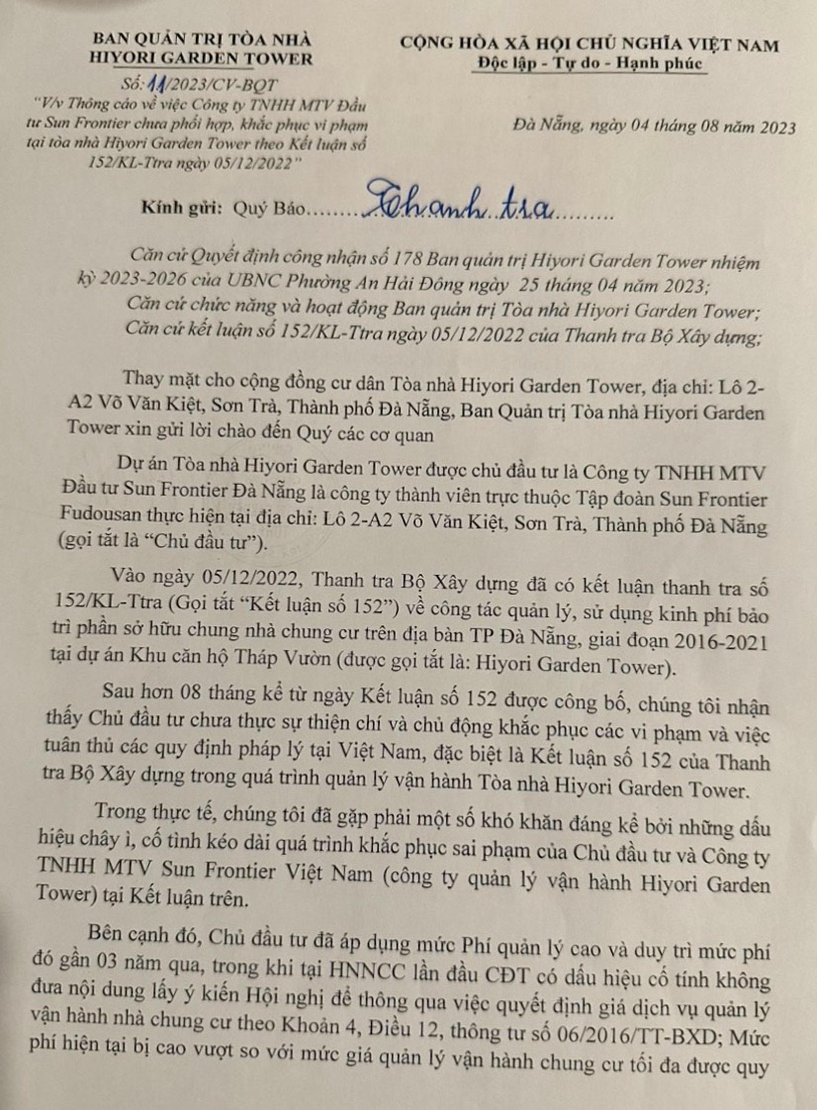 Trong văn bản của BQT tòa nhà Hiyori Garden Tower gửi Báo Thanh tra đã nêu, chủ đầu tư và Công ty TNHH Sun Frontier Việt Nam (quản lý, vận hành toà nhà) có dấu hiệu chây ì, cố tình kéo dài quá trình khắc phục sai phạm theo Kết luận thanh tra của Thanh tra Bộ Xây dựng.
