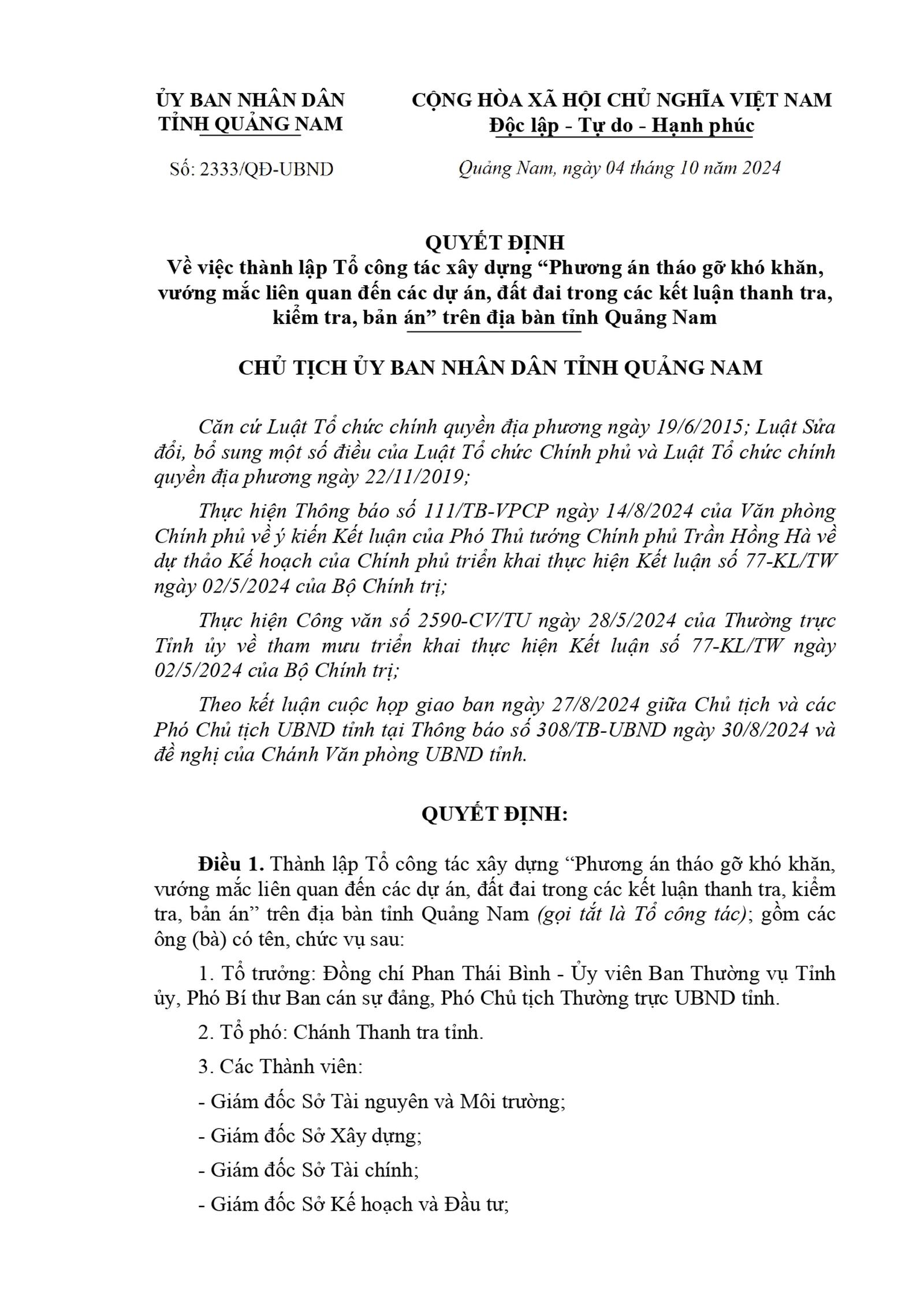 Quyết định số 2333/QĐ-UBND ngày 4/10/2024 của UBND tỉnh Quảng Nam. Ảnh: Lâm Ánh