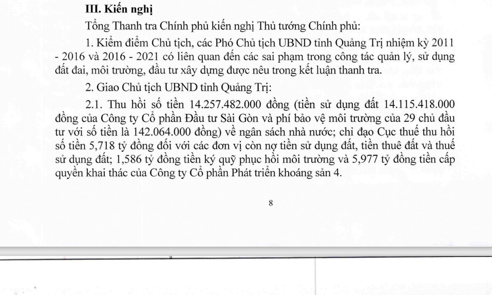 Tại KLTT số 2282/KL-TTCP, Tổng TTCP đã kiến nghị Thủ tướng Chính phủ kiểm điểm chủ tịch, các phó chủ tịch UBND tỉnh Quảng Trị nhiệm kỳ 2011-2016 và 2016-2021 có liên quan đến các sai phạm trong công tác quản lý, sử dụng đất đai, môi trường, đầu tư xây dựng được nêu trong KLTT.