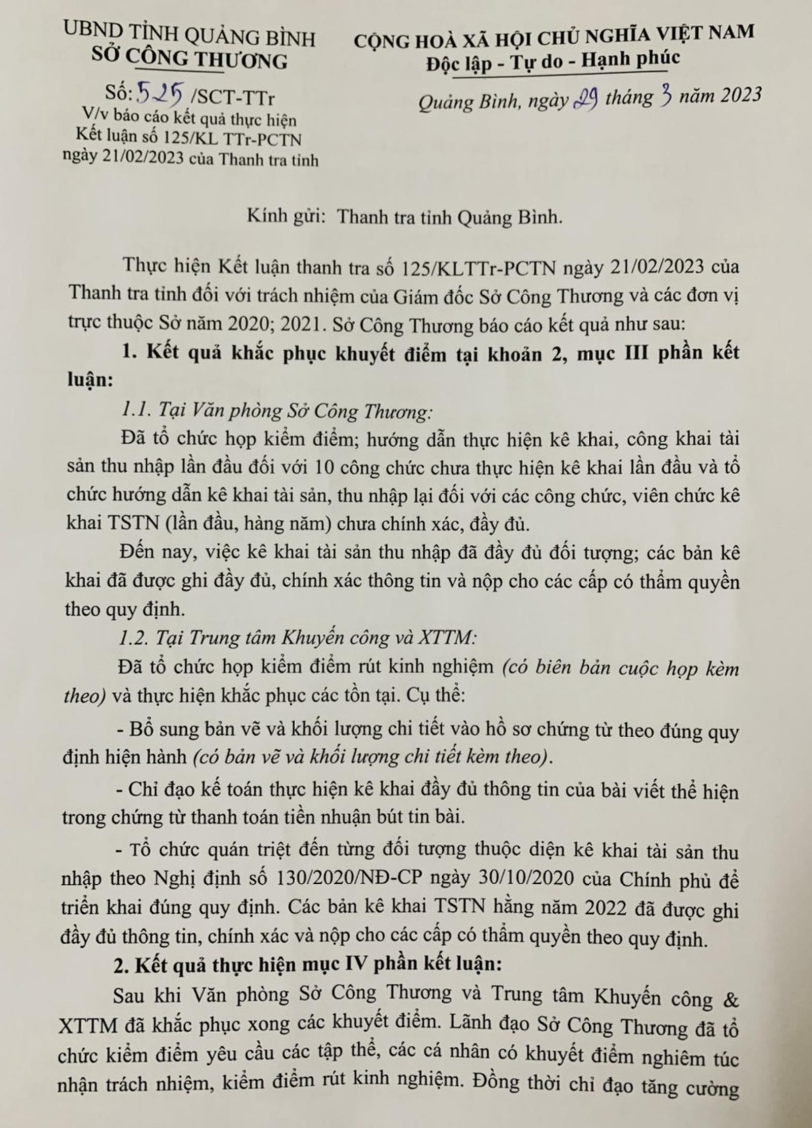 Văn bản số 525/SCT-TTr ngày 29/3/2023 về việc báo cáo kết quả thực hiện kết luận thanh tra của Sở Công thương gửi Thanh tra tỉnh Quảng Bình cho thấy, tại Văn phòng Sở Công thương đã tổ chức kiểm điểm đối với các tổ chức, cá nhân có liên quan đến những khuyết điểm được chỉ ra trong kết luận thanh tra; hướng dẫn thực hiện kê khai, công khai TSTN lần đầu đối với 10 công chức chưa thực hiện kê khai lần đầu và tổ chức hướng dẫn kê khai TSTN lại đối với các công chức, viên chức kê khai TSTN (lần đầu, hàng năm) chưa chính xác, đầy đủ.