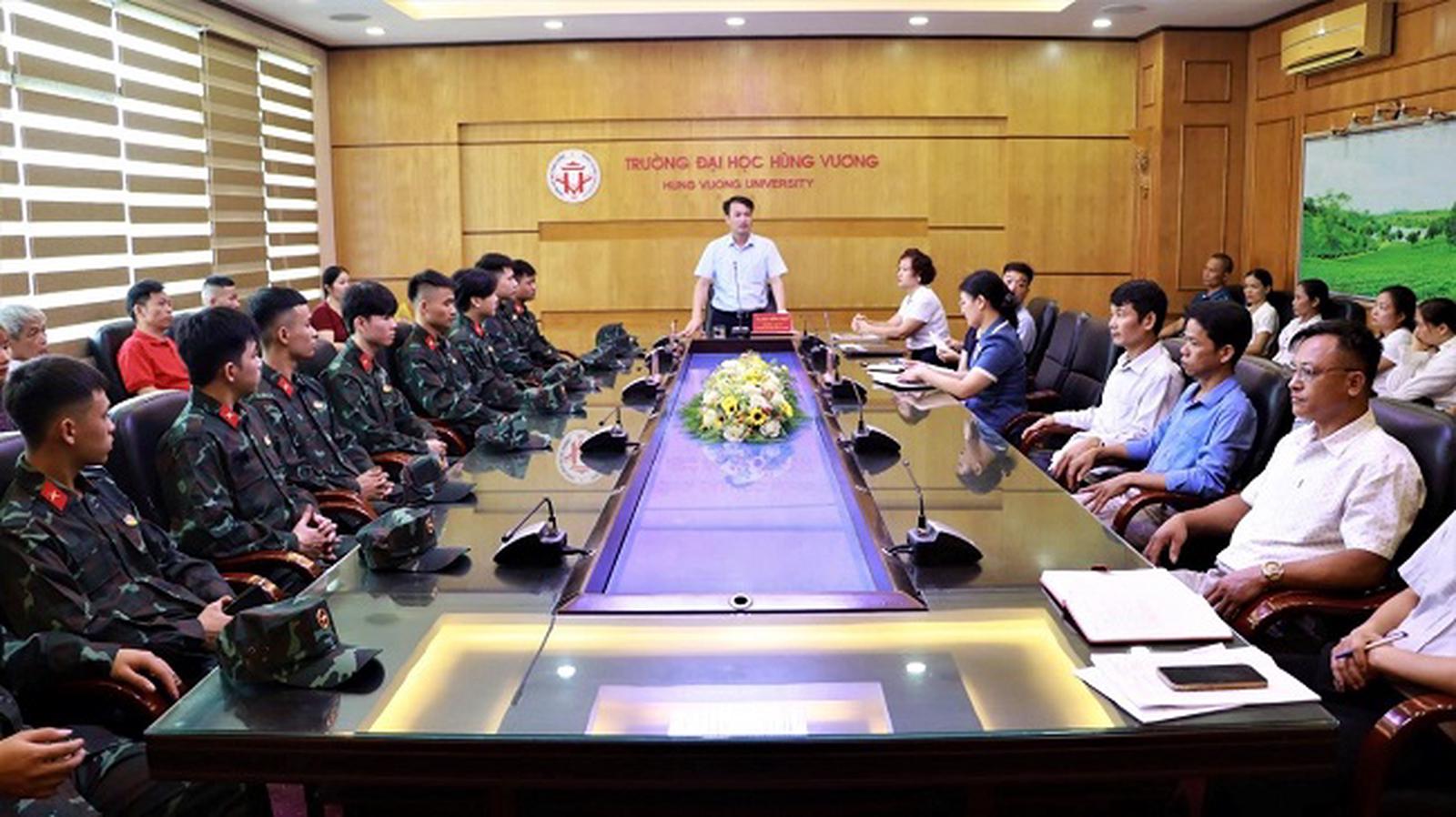 Ban Giám hiệu trường gặp mặt nam sinh viên tốt nghiệp tham gia đào tạo sĩ quan dự bị tại Trường Quân sự Quân Khu 2 năm 2024. Ảnh: MA
