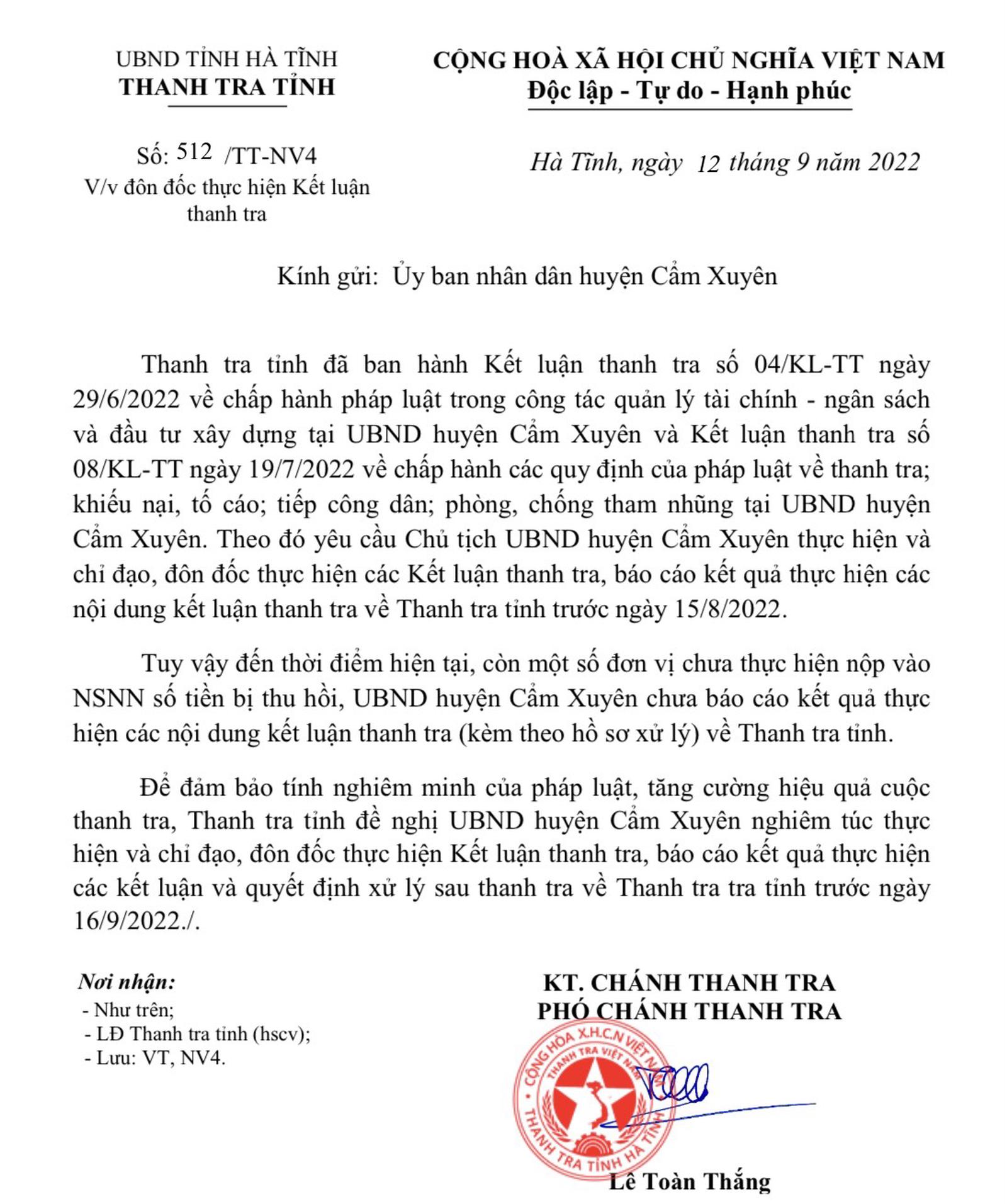 Văn bản số 512/TT-NV4 ngày 12/9/2022 của Thanh tra tỉnh đôn đốc thực hiện kết luận thanh tra gửi UBND huyện Cẩm Xuyên. Ảnh: TQ