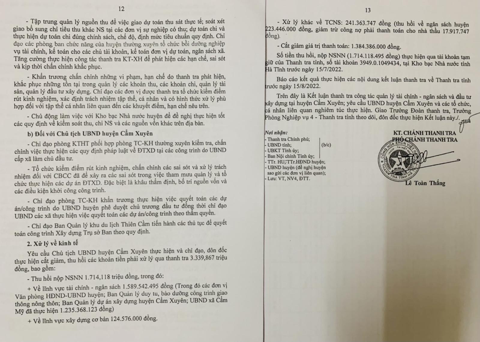 Thanh tra tỉnh đề nghị Chủ tịch UBND huyện Cẩm Xuyên thực hiện và chỉ đạo, đôn đốc thực hiện cắt giảm, thu hồi các khoản tiền phải xử lý qua thanh tra trên 3,339 tỷ đồng gồm: Thu hồi nộp ngân sách trên 1,741 tỷ đồng; xử lý khác về thu chi ngân sách trên 241,363 triệu đồng; cắt giảm giá trị thanh toán trên 1,384 tỷ đồng.