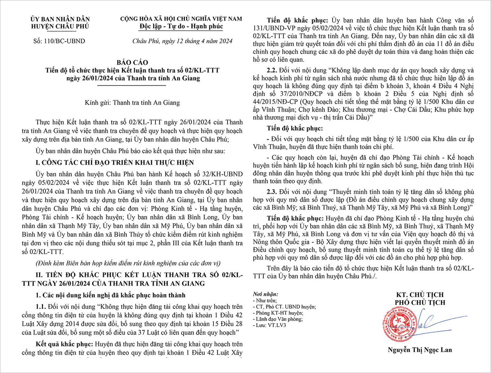 UBND huyện Châu Phú cho biết, một số nội dung kiến nghị của kết luận thanh tra đã được khắc phục hoàn thành. Huyện đã thực hiện đăng tải công khai quy hoạch trên cổng thông tin điện tử theo quy định liên quan đến quy hoạch sau khi đồ án được phê duyệt.