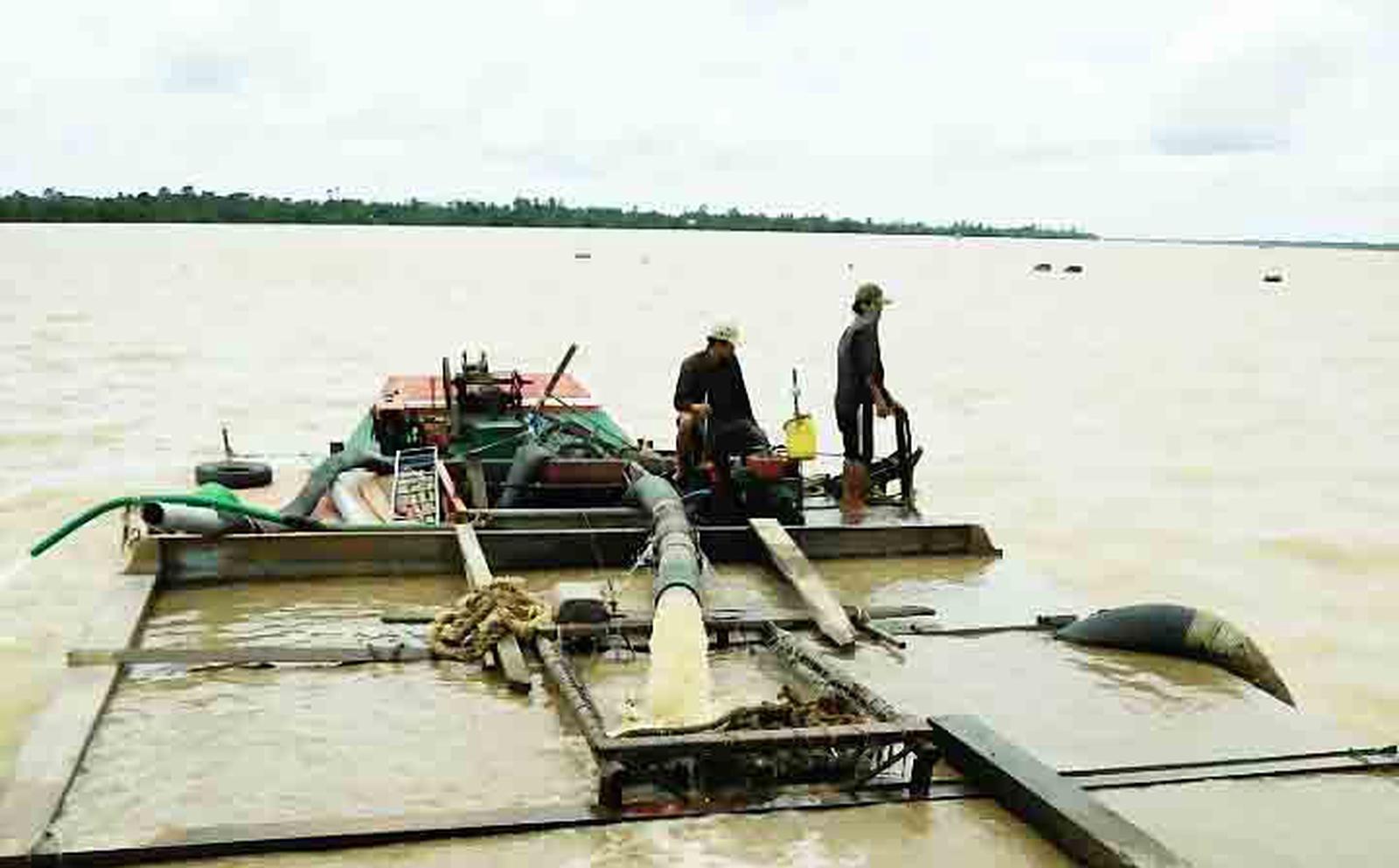 Phương tiện hút trộm cát trên sông Bang Tra, huyện Vũng Liêm bị lực lượng chức năng phát hiện. Ảnh: Công an Vĩnh Long
