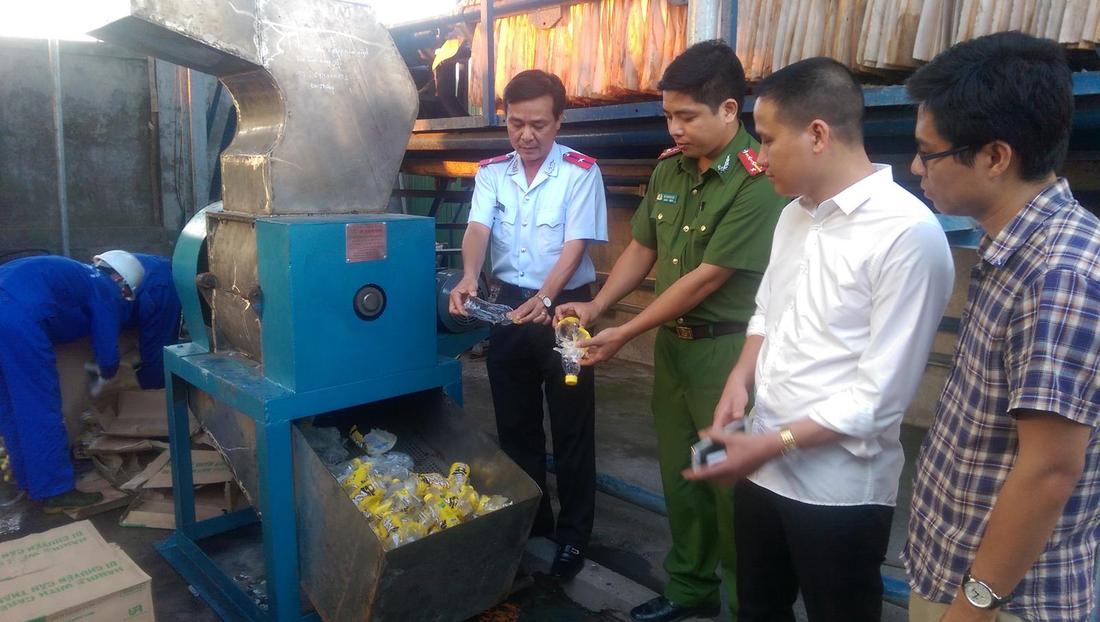 Sản phẩm được tiêu hủy dưới sự chứng kiến của các cơ quan chức năng. Ảnh: NN