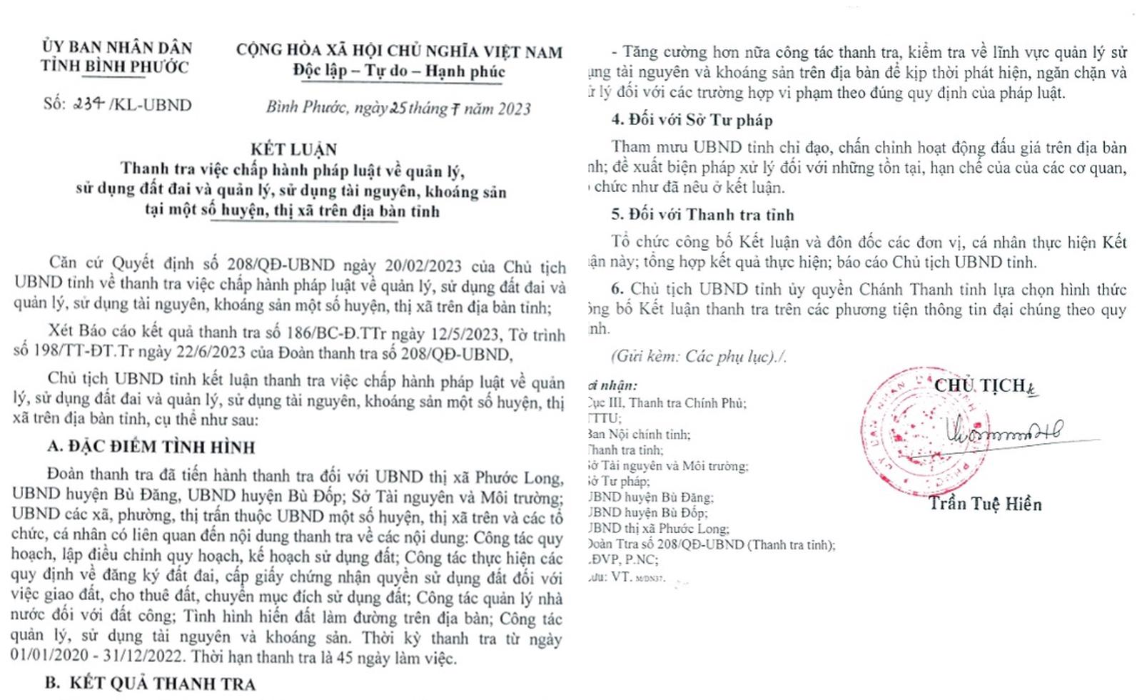 Chủ tịch UBND tỉnh Bình Phước ký ban hành KLTT số 234/KL-UBND ngày 25/7/2023, thanh tra việc chấp hành pháp luật về quản lý đất đai và quản lý, sử dụng tài nguyên, khoáng sản tại một số huyện, thị xã trên địa bàn tỉnh.